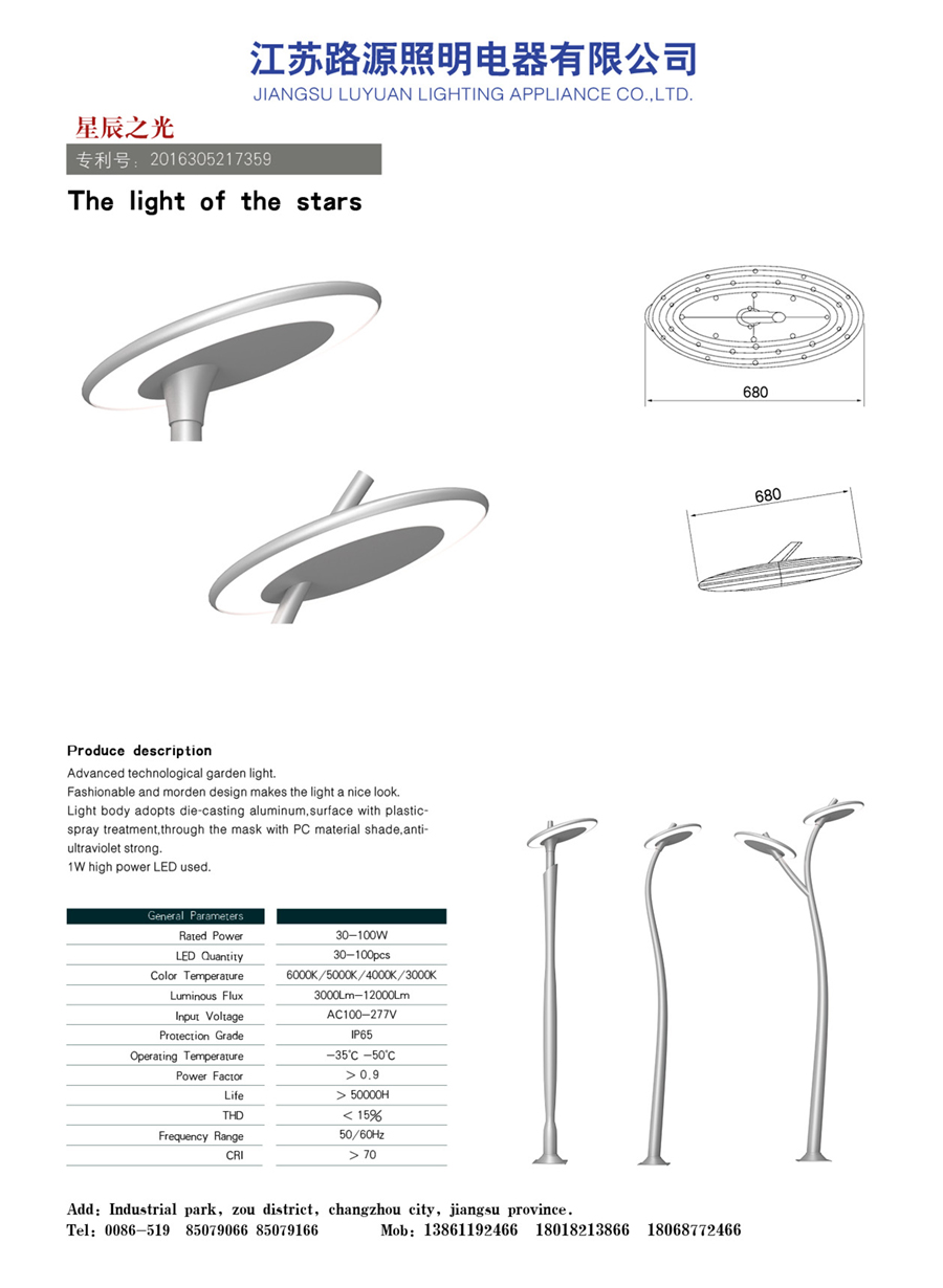 常州路源照明电器有限公司专业生产各种路灯钢杆、庭院灯和各种户外照明灯具,是一家集设计研究、生产制造和安装为一体的综合现代化照明企业。 公司已形成了技术科研,产品开发,批量生产和市场销售相结合的完整经营体系,超前的经营理念,强大的研发能力,先进的生产工艺和团结有力的团体队队,使公司产品不断得到国内外用户的青睐和厚爱,赢得了良好的经济效益和社会效益。近年来公司着眼全球照明发展趋势,结合产品应用实际,与美国通用电气(GE照明)荷兰飞利浦照明、德国欧司朗照明、中国上海亚明灯泡厂有限公司合作,成为以上全球知名照明企业良好的合作单元。信诚质精,共羸未来,路源人愿与一切致力于中国照明事业发展的人士携手合作,开创中国照明事业的美好未来。