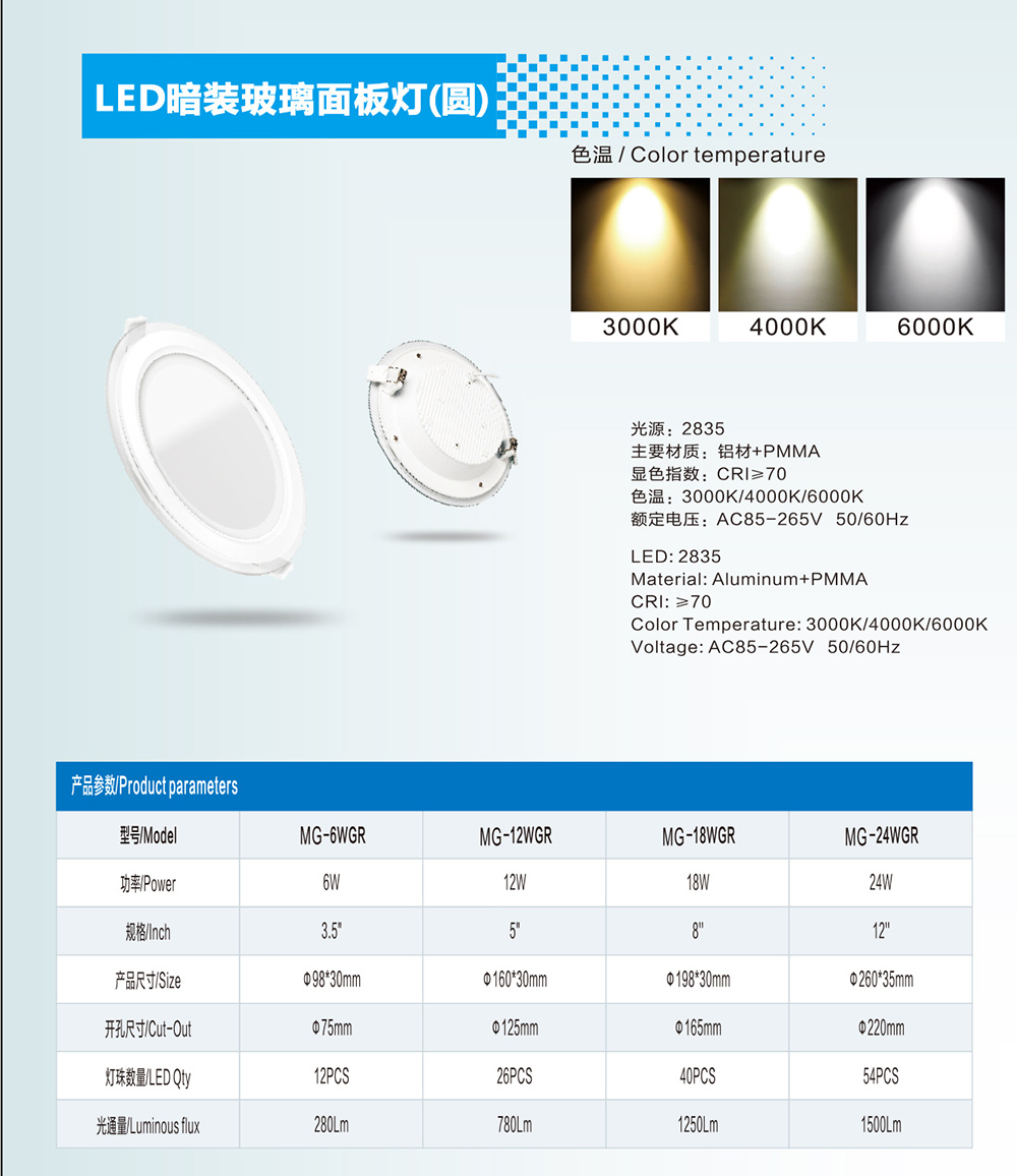 LED暗装玻璃面板灯 圆形面板灯6W 12W 18W 24W
