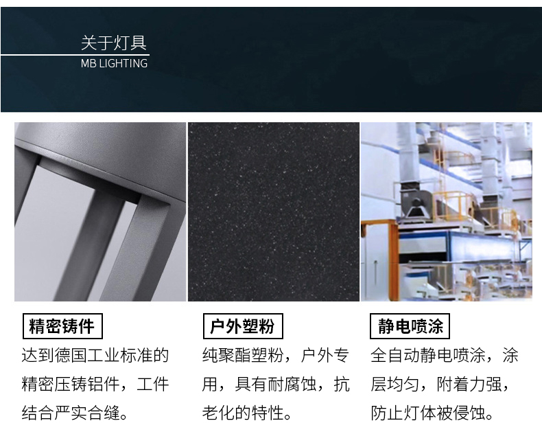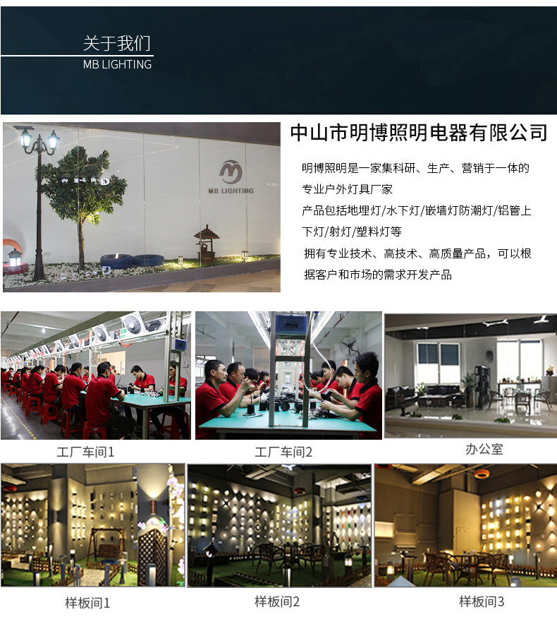 明博照明是一家集科研、生产、营销于一体的专业户外灯具厂家。 “耐用美观、人文环保”是未来照明的发展趋势。我们公司非常注重产品的品质, 并力争开发好的产品。我们还可以根据客户和市场的需要来开发产品。 我们的产品包括地埋灯、水下灯、草坪灯、嵌墙灯、防潮灯、铝管上下灯、射灯。 塑料灯等等。被广泛地应用于城市亮化工程。建筑物和公共场所的美化。所有的产品都 是专业设计、高技术、质量优秀,并且获得了3C和CE认证,我们的产品销往香港、台湾、 东南亚、中东、欧美等国家。 “质量第一、客户第一”是我们的发展精神,我们诚恳地希望和广大国外新老客户 建立和创造长期的友好合作关系。 我们相信我们的优质服务和高质量的产品会令我们所有的客户感到满意,而且我们 公道的价格会带给您更多的订单和利润。