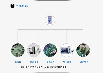 从功能上讲,披覆胶不仅只有“三防”,三防一般指防潮、防盐雾、防霉、防尘、防震、防腐蚀、防漏电、防老化、绝缘、延寿等功能,从应用上讲,披覆胶在电子电器、家电行业、数码电子、led、汽车工业、航空航天、航海、医疗等行业都有其身影,能为这些行业的电子装置、线路板、通讯器件等精密元器件提供全方位的保护。