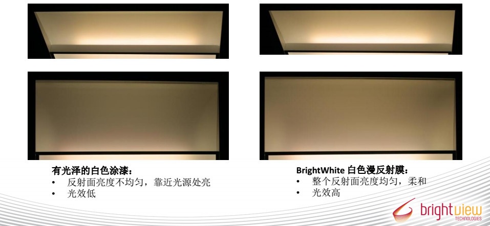 Bright View_白色漫反射膜提供超高反射率,适用于照明,灯具,显示屏以及标牌。与使用白色凃漆,阻焊层或粉末涂料的灯具相比,贴合Bright View反射膜的灯具能额外提供多达30%的光输出。