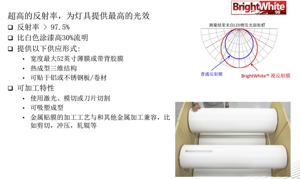 BrightView_白色漫反射膜提供超高反射率,适用于照明,灯具,显示屏以及标牌。与使用白色凃漆,阻焊层或粉末涂料的灯具相比,贴合BrightView反射膜的灯具能额外提供多达30%的光输出。BrightView反射膜可供应为带背胶或不带背胶的薄膜。可使用激光,模切或刀具轻松整齐地裁切。可利用吸塑热成型技术3D成型以贴合灯具内壁。采用金属基材贴合的反射膜可使用切割,冲压,轧辊及其他标准金属片材加工工艺。
