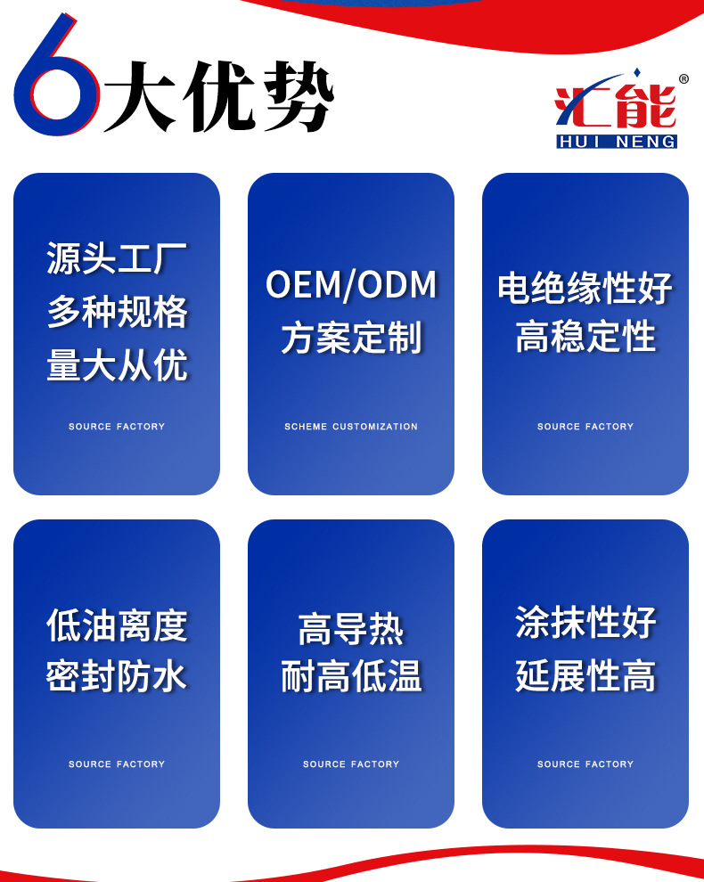 中山市汇能硅胶制品有限公司位于中山市东凤镇,多年来我司一直致力于高分子新型材料的研发、合成、生产、销售。我们专业生产:(1)单组份室温固化硅橡胶 (2)双组份灌封胶 (3)导热硅脂 具有良好的粘接、密封、防水、固定、绝缘、防震、耐高低温、抗紫外线老化等性能。并与金属、玻璃、陶瓷、塑料各种新型材料的粘接。已广泛应用于电子、电器、电源、灯具、汽车及综合小家电产品。 产品通过UL安全测试认证,FDA无毒测试认证,TUV老化测试认证,以及ROHS指令标准认证,已成为全球绿色合作伙伴。 质量是我们追求的永恒主题。是企业的生命,我们始终坚信没有今天的质量就没有明天的市场,以质量求生存,以信誉求发展,进一步推进实施用户满意式工程,是我们一切工作的起点与目标。我们将致力于您的事业,为您提供更优质的产品和完美的服务。