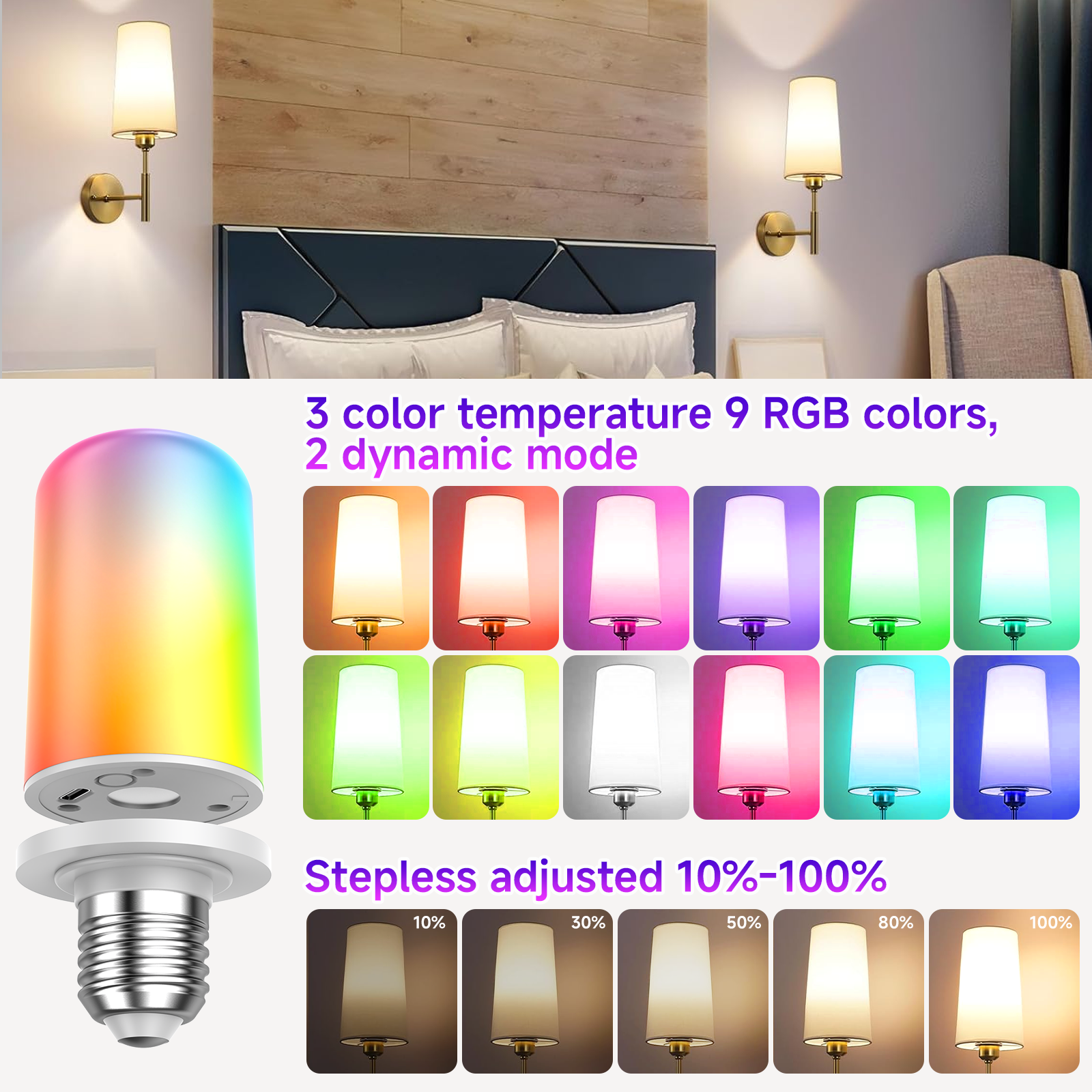 • 光源可调性 亮度调节、色温调节