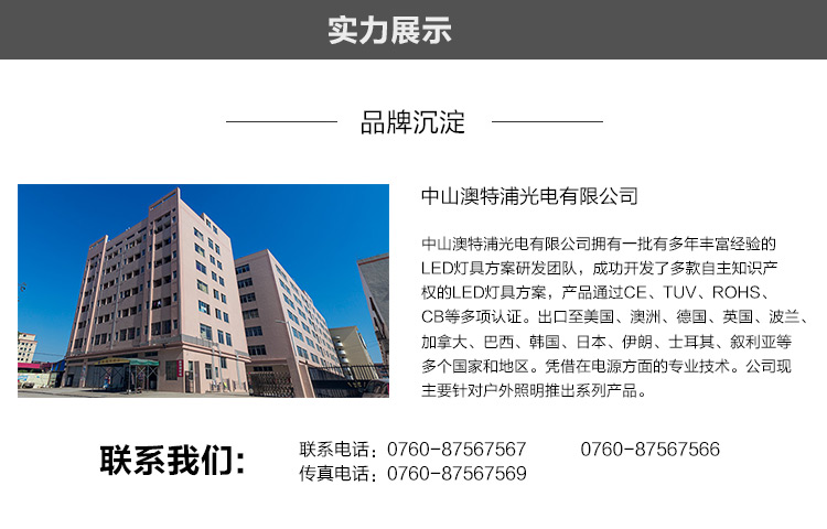 中山澳特浦光电有限公司成立于2010年,荣获“高新技术企业”称号。公司位于灯饰之都广东省中山市。 澳特浦在工业园区占地面积30000平方米,拥有300多名经验丰富的生产员工,强大的研发部门30名专业工程师和42名海外市场销售人员,以确保公司的高效运作。作为公认的知名LED照明企业,我们获得了包括设计和实用新型在内的100多项专利,始终处于照明行业的前列。 2010年至今,澳特浦始终专注于高科技AC灯和太阳能灯的开发和制造,提供全方位的智能太阳能/AC路灯/泛光灯/花园灯、太阳能AC/DC风扇、多功能太阳能家庭系统等。其他AC能产品。 澳特浦已获得ISO9001质量管理体系认证、中国节能认证、SGS、CB、CE、ROHS、TUV等多项证书。我们坚持以“制造世界一流的太阳能产品”为目标,以“为客户提供最具性价比的产品”为使命,以“制造一流的环保产品”为社会责任。