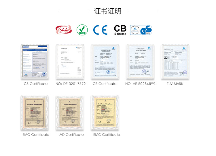 • 认证 CE、ROHS、3C、CB、LED、ISO、EMC、SAA