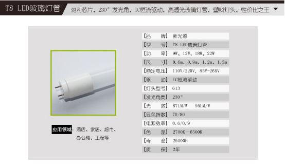 新光源T8 LED玻璃灯管采用高亮LED芯片,IC恒流驱动,90%以上高透光率的玻璃灯管,拥有320°的发光角度,寿命长达25000小时,同时提供两年质保,定制包装,是高性价比的一款灯管。我们的产品经过严格的光衰、高温、耐压、绝缘测试,保证出厂每一根灯管的优良品质。
