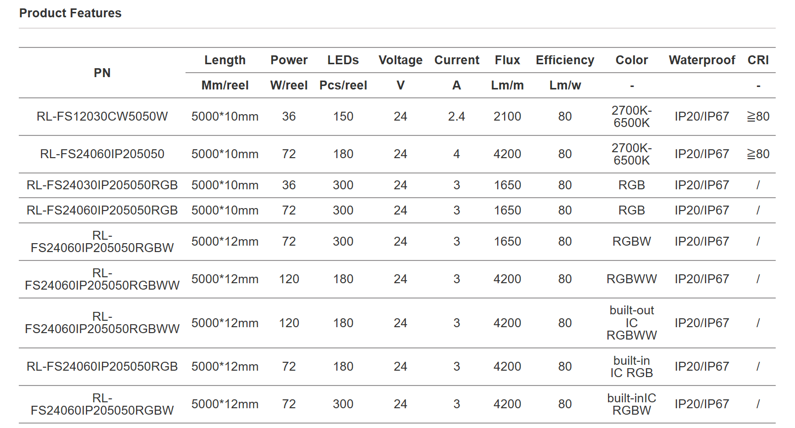 • 发光颜色 正白、暖白、RGB、RGBW全彩