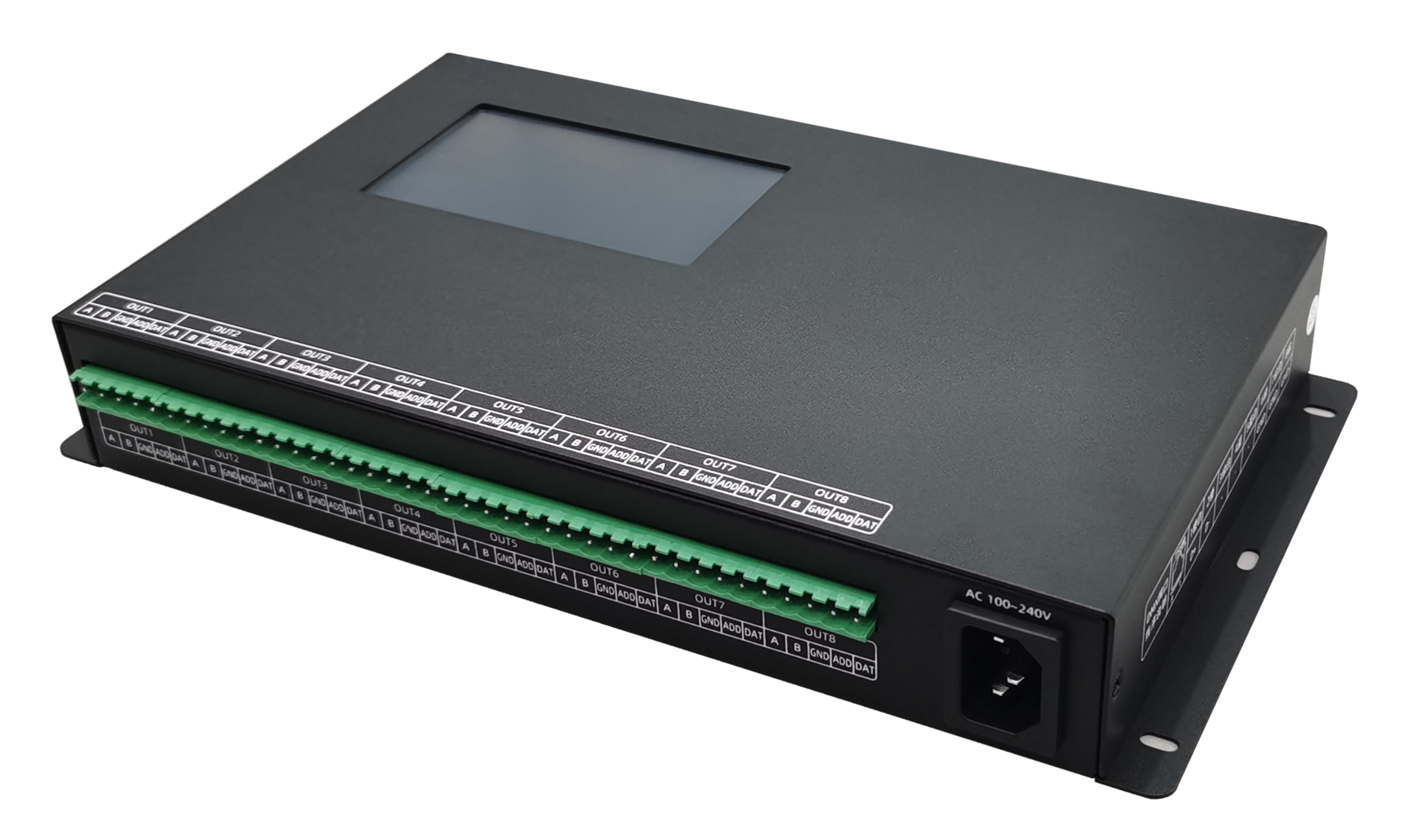 1、产品资料(1)外壳材质: 铁(2)输入电压: AC 100V~240V(3)外壳材质: 铁 (4)输入电压: AC100~240V (5)输入信号: SW 以太网协议 (6)输出端口: (带隔离)TTL 电平信号 RS-485 ×8 路 (7)驱动点数: ①Madrix 软件带灯数: TTL 灯具:4 universes×512 通道×8 路 DMX 灯具:2 universes×512 通道×8 路 ②LED Player 软件带灯数: SW 单片机灯具:2880 通道×8 路; 单线灯具:3072 通道×8 路; 标准 DMX512 灯具:512 通道×8 路; 扩展 DMX 灯具:1024 通道×8 路; 断点续传:2160 通道×8 路; 65536 灰阶:2160 通道×8 路。 (8)输出功率: 5W (9)工作温度: -25℃~70℃ (10)相对湿度: ≤50% RH (11)级联方式: 并联(手动编址) (12)防护等级: IP20(13)尺寸: L285*W156*H44(mm) 2、功能概述(1)支持接入并受控于 LED Player 软件,对复杂造型的显示屏,有独特的数据处理方式,轻松制订解决 方案。 (2) 可分别单独接入电脑或 SN 使用,最大支持 100W 通道或 400 台控制盒级联。 (3)标准的 RJ45 网络接口,遵循 UDP 协议。 (4)支持 Art-Net(Madrix3、Madrix5 等软件)搜索及控灯,单台可接收 36 个空间控灯数据。 (5)支持一键写码功能、LED Player 软件搜索设备与检测丢包率。 (6)支持我司的 IAPLoader 软件在线升级。 (7)8 路独立信号数据输出(带隔离),控制各类常规芯片的 LED 护栏管屏、点光源屏、大功率洗墙灯 等。(8)附送专业效果制作软件,用户可自行制作任意效果。 (9)配合定制硬件使用即可实现数据与硬件加密功能,以保障工程的安全性。