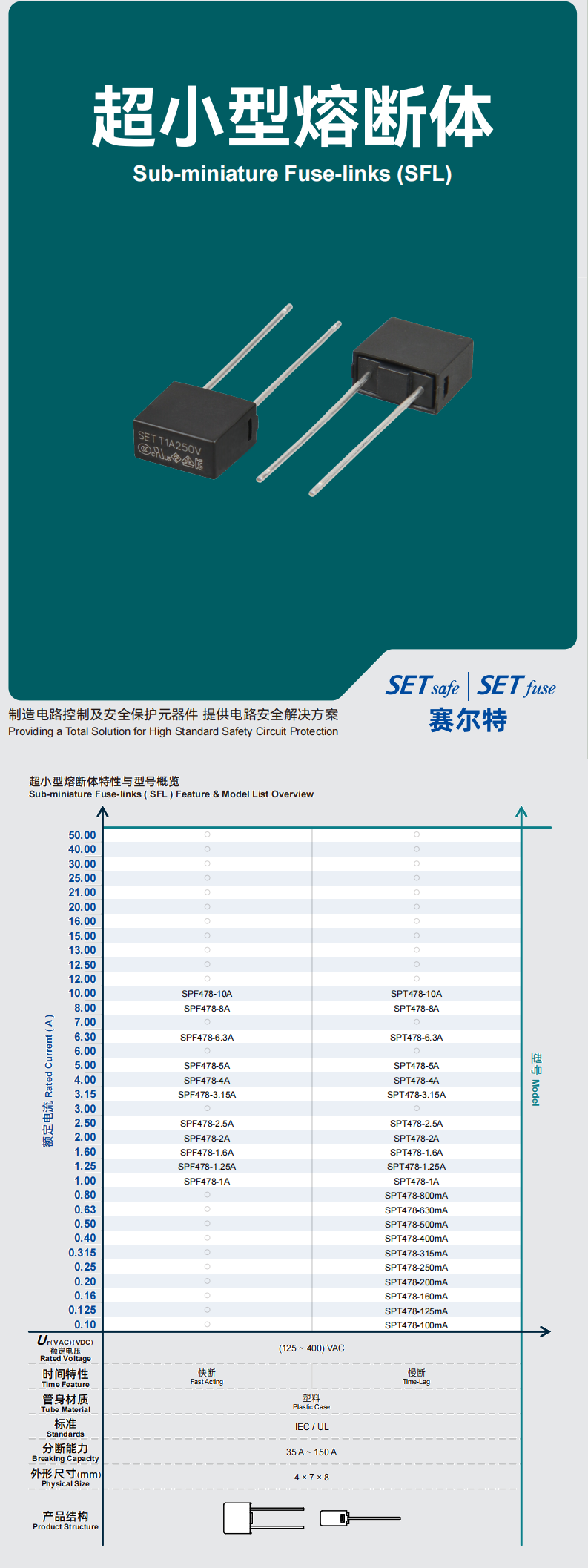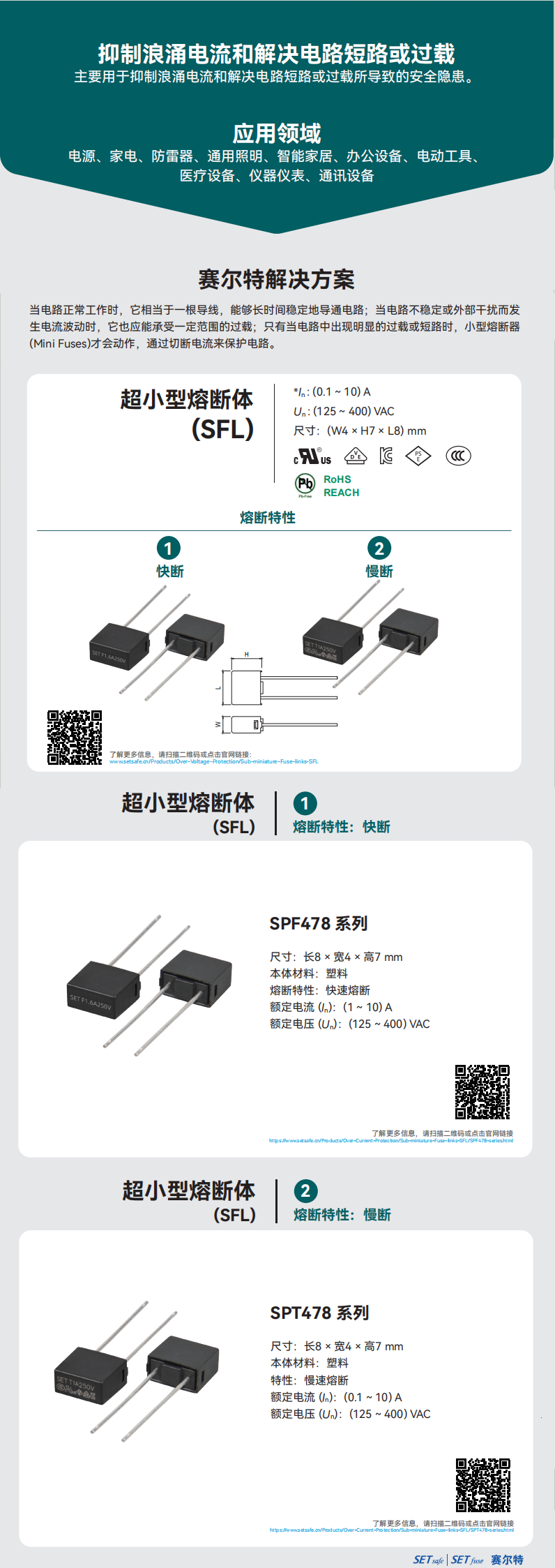 厦门赛尔特电子股份有限公司(以下简称SETfuse)是一家设计、制造电路保护元器件与提供电路综合保护解决方案的公司,致力于创新的过温保护、过电流保护、过电压保护、主动保护、组合保护的技术研究,帮助客户提高其产品的安全指数。SETfuse为工业、消费电子、新能源和高可靠性市场开发、制造、销售产品。提供业界领先的温度保险丝(TCO)、压敏电阻(MOV)、热保护型压敏电阻(TFMOV)、电涌保护器(SPD)、线绕熔断电阻器(RXF)、热保护型熔断电阻器(TRXF)、电流保险丝(FUSE)、主动熔断器(iTCO),以及适配器保护单元(PUA)等产品。产品与品质SETfuse拥有15年创新的历史并获得多项专利。突破性的创新设计、工艺,自动化生产,让我们的产品在业界处于领先地位。我们拥有美国UL授权的UL 1449,UL 60691标准目击测试实验室(WTDP),专业的测试设备和完备的质量(ISO9001)、环境(ISO14001)、职业健康安全(OHSAS18000)管理体系,产品满足RoHS、 REACH要求,取得CCC、UL、 CUL、VDE、TUV、PSE、KTL安规认证。严苛的品质管控方法,成就了SETfuse值得信赖的高品质产品。企业责任SETfuse的产品销往全球市场。我们深知这意味着我们有更多的社会责任。我们提供安全的工作场所与环境,并确保遵守法规。客户关系SETfuse的产品在电路保护领域发挥着举足轻重的作用,我们致力于创建和维护卓越的客户关系。从产品设计、制造到专业的客户服务和支持,我们知道什么对您很重要。关于赛尔特电子有限公司的更多信息,我们真诚的感谢您访问公司网站:www.SETfuse.com。