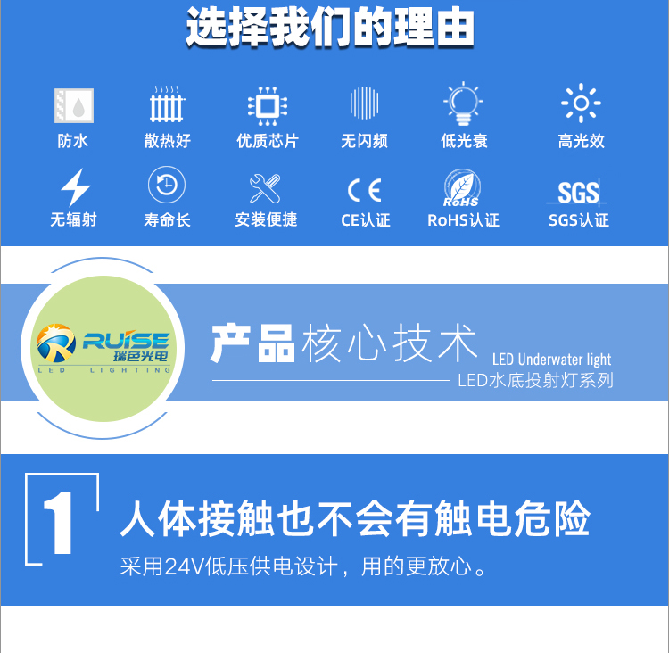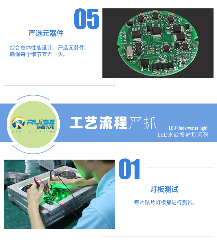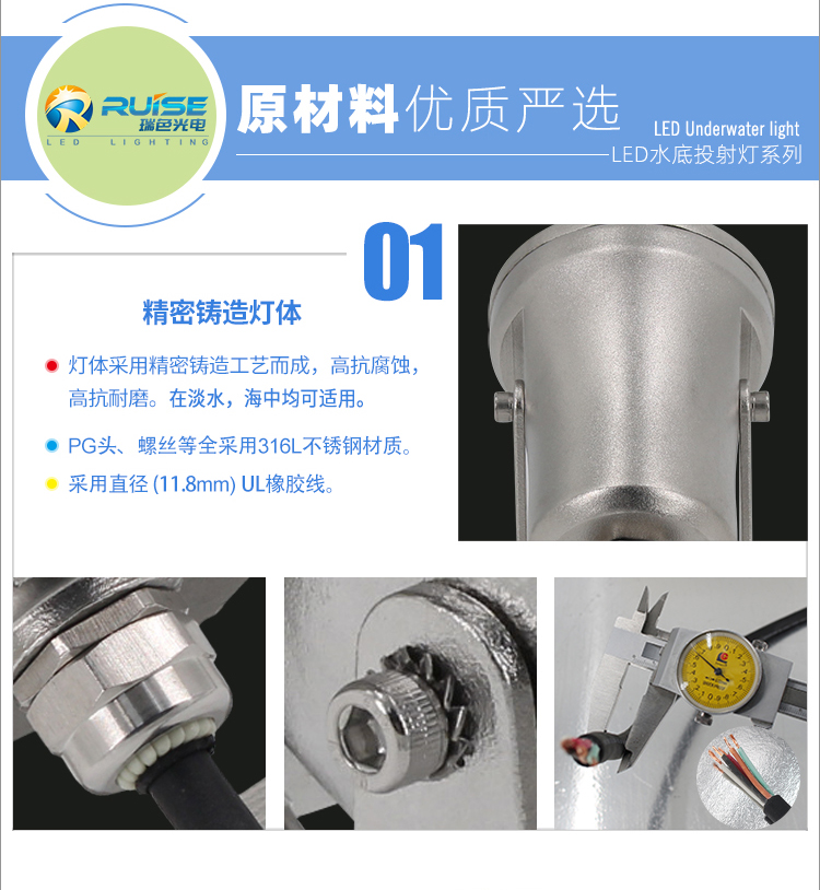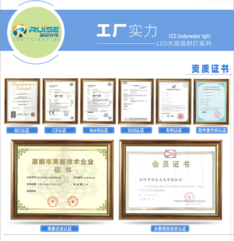 深圳瑞色光电有限公司成立于2010年,专注户外景观灯具研发生产,技术方案提供。注册资金520万,是深圳市高新技术企业和ISO9001:2015认证企业。 公司产品有水底灯,喷泉灯,泳池灯以及地埋灯等户外高端产品。所有产品在防水功能,安全性能,电气参数,光学参数,方案设计等方面都达到行业领先水平,稳步成为国内和国际户外景观照明行业的引领者。 我们占地3000平方米,拥有一流的研发技术团队和精湛的专业队伍,获得国家专利证书和软件著作权30多项, 所有产品均通过CE, RoHS, SGS, UL, IP防护等级等认证。并能迅速为客户以及工程商量身定制不同规格需求的产品。 凭借强大的研发能力及稳定的产品性能,我们得到美国,加拿大,西班牙,以色列,俄罗斯等国代理商和工程商的衷诚认可,参与的欧美市政项目200多个。 持续创新,为客户创造价值,是我们永不妥协的选择。真诚与广大客户和工程商携手共创美好未来。