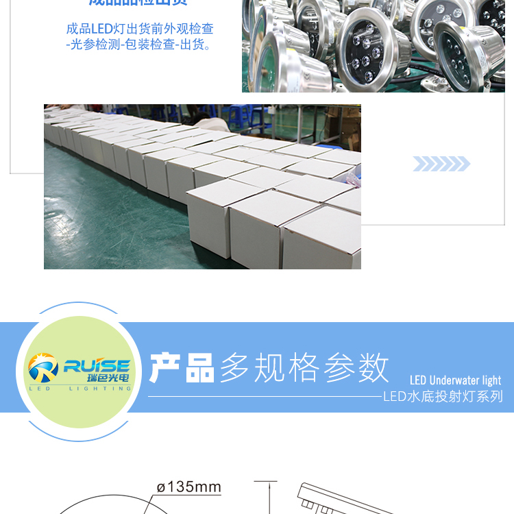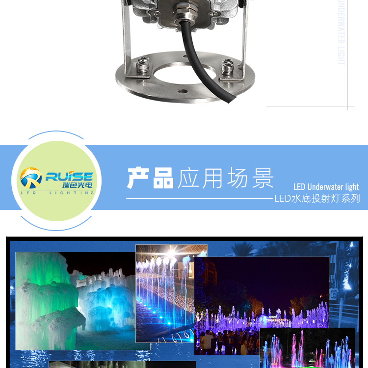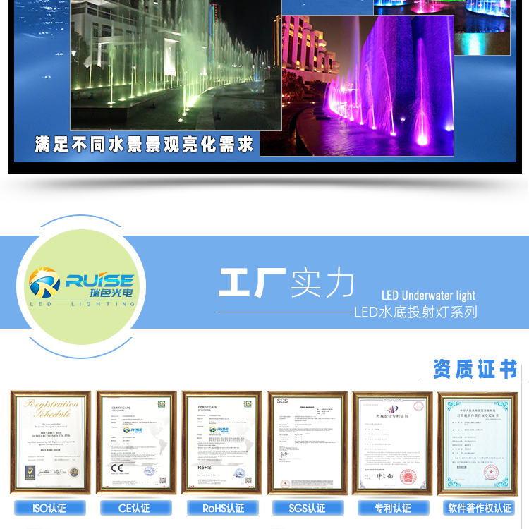 深圳瑞色光电有限公司成立于2010年,专注户外景观灯具研发生产,技术方案提供。注册资金520万,是深圳市高新技术企业和ISO9001:2015认证企业。 公司产品有水底灯,喷泉灯,泳池灯以及地埋灯等户外高端产品。所有产品在防水功能,安全性能,电气参数,光学参数,方案设计等方面都达到行业领先水平,稳步成为国内和国际户外景观照明行业的引领者。 我们占地3000平方米,拥有一流的研发技术团队和精湛的专业队伍,获得国家专利证书和软件著作权30多项, 所有产品均通过CE, RoHS, SGS, UL, IP防护等级等认证。并能迅速为客户以及工程商量身定制不同规格需求的产品。 凭借强大的研发能力及稳定的产品性能,我们得到美国,加拿大,西班牙,以色列,俄罗斯等国代理商和工程商的衷诚认可,参与的欧美市政项目200多个。 持续创新,为客户创造价值,是我们永不妥协的选择。真诚与广大客户和工程商携手共创美好未来。