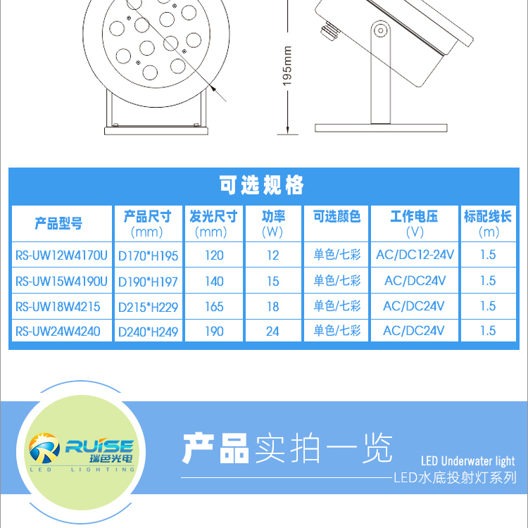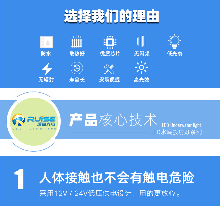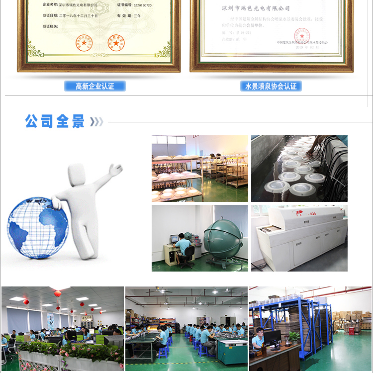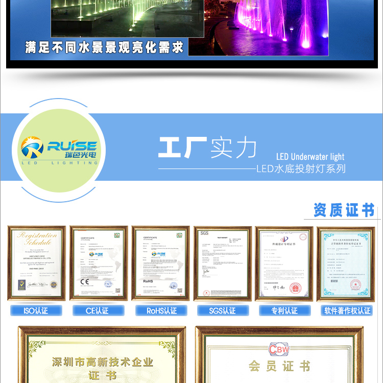 深圳瑞色光电有限公司成立于2010年,专注户外景观灯具研发生产,技术方案提供。注册资金520万,是深圳市高新技术企业和ISO9001:2015认证企业。 公司产品有水底灯,喷泉灯,泳池灯以及地埋灯等户外高端产品。所有产品在防水功能,安全性能,电气参数,光学参数,方案设计等方面都达到行业领先水平,稳步成为国内和国际户外景观照明行业的引领者。 我们占地3000平方米,拥有一流的研发技术团队和精湛的专业队伍,获得国家专利证书和软件著作权30多项, 所有产品均通过CE, RoHS, SGS, UL, IP防护等级等认证。并能迅速为客户以及工程商量身定制不同规格需求的产品。 凭借强大的研发能力及稳定的产品性能,我们得到美国,加拿大,西班牙,以色列,俄罗斯等国代理商和工程商的衷诚认可,参与的欧美市政项目200多个。 持续创新,为客户创造价值,是我们永不妥协的选择。真诚与广大客户和工程商携手共创美好未来。