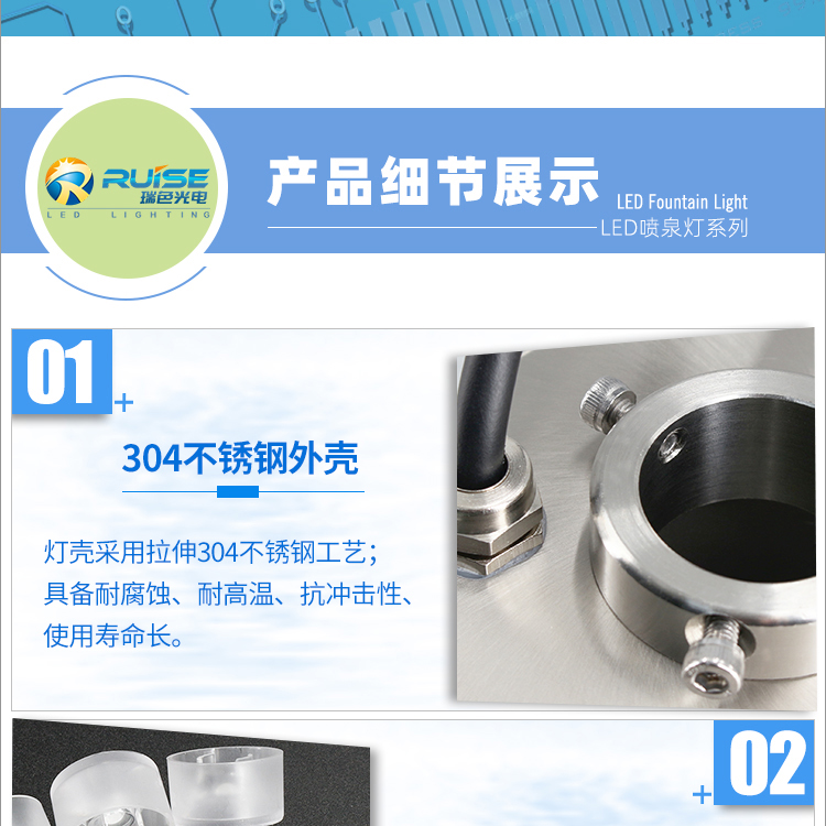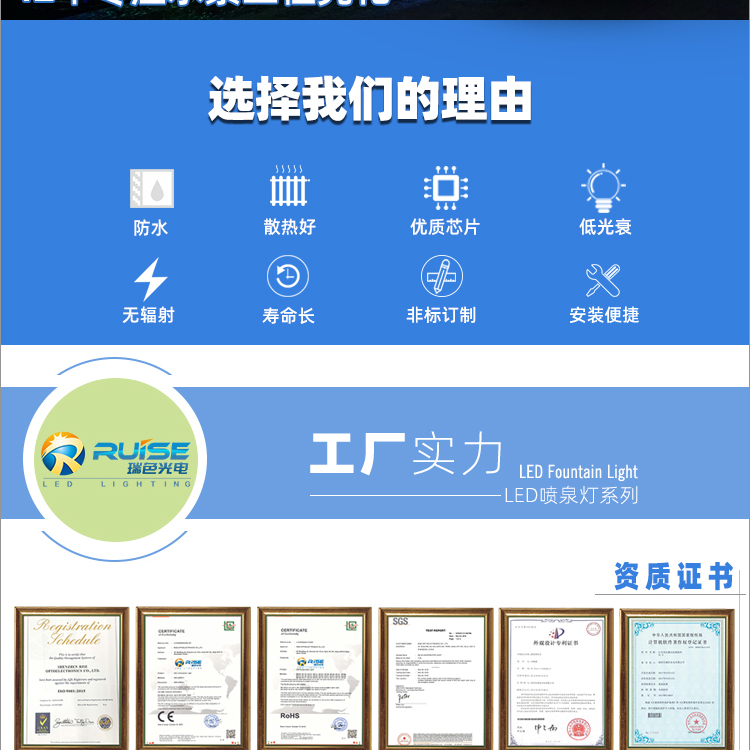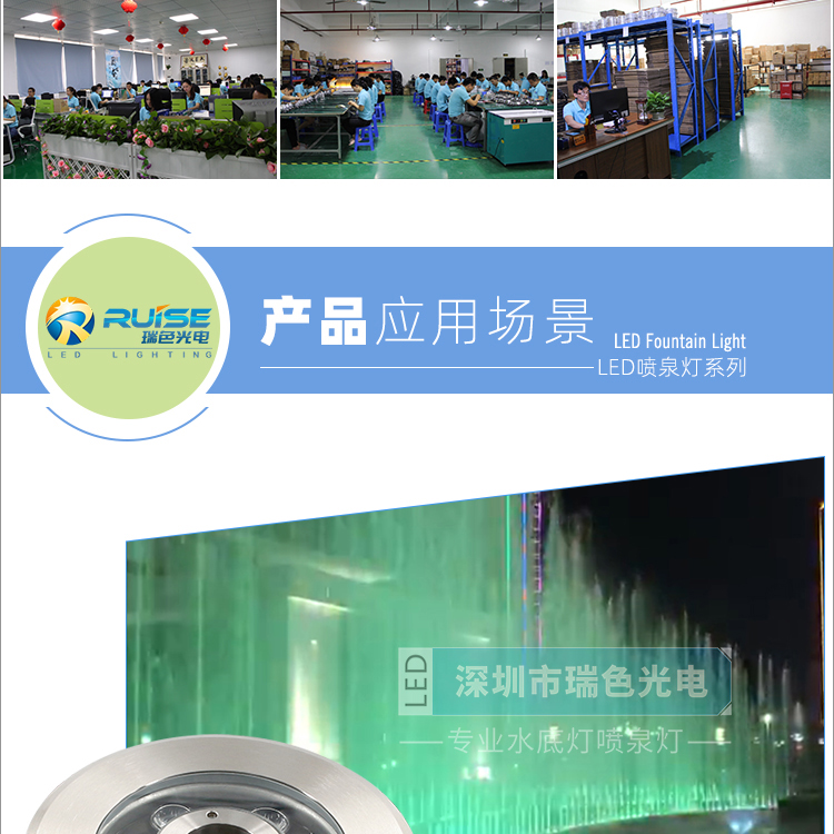 深圳瑞色光电有限公司成立于2010年,专注户外景观灯具研发生产,技术方案提供。注册资金520万,是深圳市高新技术企业和ISO9001:2015认证企业。 公司产品有水底灯,喷泉灯,泳池灯以及地埋灯等户外高端产品。所有产品在防水功能,安全性能,电气参数,光学参数,方案设计等方面都达到行业领先水平,稳步成为国内和国际户外景观照明行业的引领者。 我们占地3000平方米,拥有一流的研发技术团队和精湛的专业队伍,获得国家专利证书和软件著作权30多项, 所有产品均通过CE, RoHS, SGS, UL, IP防护等级等认证。并能迅速为客户以及工程商量身定制不同规格需求的产品。 凭借强大的研发能力及稳定的产品性能,我们得到美国,加拿大,西班牙,以色列,俄罗斯等国代理商和工程商的衷诚认可,参与的欧美市政项目200多个。 持续创新,为客户创造价值,是我们永不妥协的选择。真诚与广大客户和工程商携手共创美好未来。