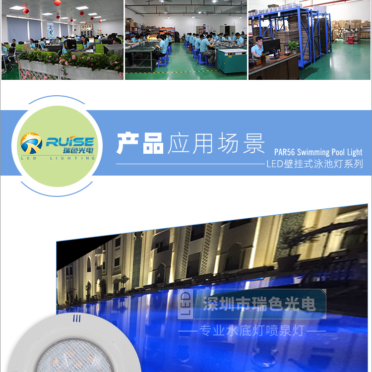 深圳瑞色光电有限公司成立于2010年,专注户外景观灯具研发生产,技术方案提供。注册资金520万,是深圳市高新技术企业和ISO9001:2015认证企业。 公司产品有水底灯,喷泉灯,泳池灯以及地埋灯等户外高端产品。所有产品在防水功能,安全性能,电气参数,光学参数,方案设计等方面都达到行业领先水平,稳步成为国内和国际户外景观照明行业的引领者。 我们占地3000平方米,拥有一流的研发技术团队和精湛的专业队伍,获得国家专利证书和软件著作权30多项, 所有产品均通过CE, RoHS, SGS, UL, IP防护等级等认证。并能迅速为客户以及工程商量身定制不同规格需求的产品。 凭借强大的研发能力及稳定的产品性能,我们得到美国,加拿大,西班牙,以色列,俄罗斯等国代理商和工程商的衷诚认可,参与的欧美市政项目200多个。 持续创新,为客户创造价值,是我们永不妥协的选择。真诚与广大客户和工程商携手共创美好未来。
