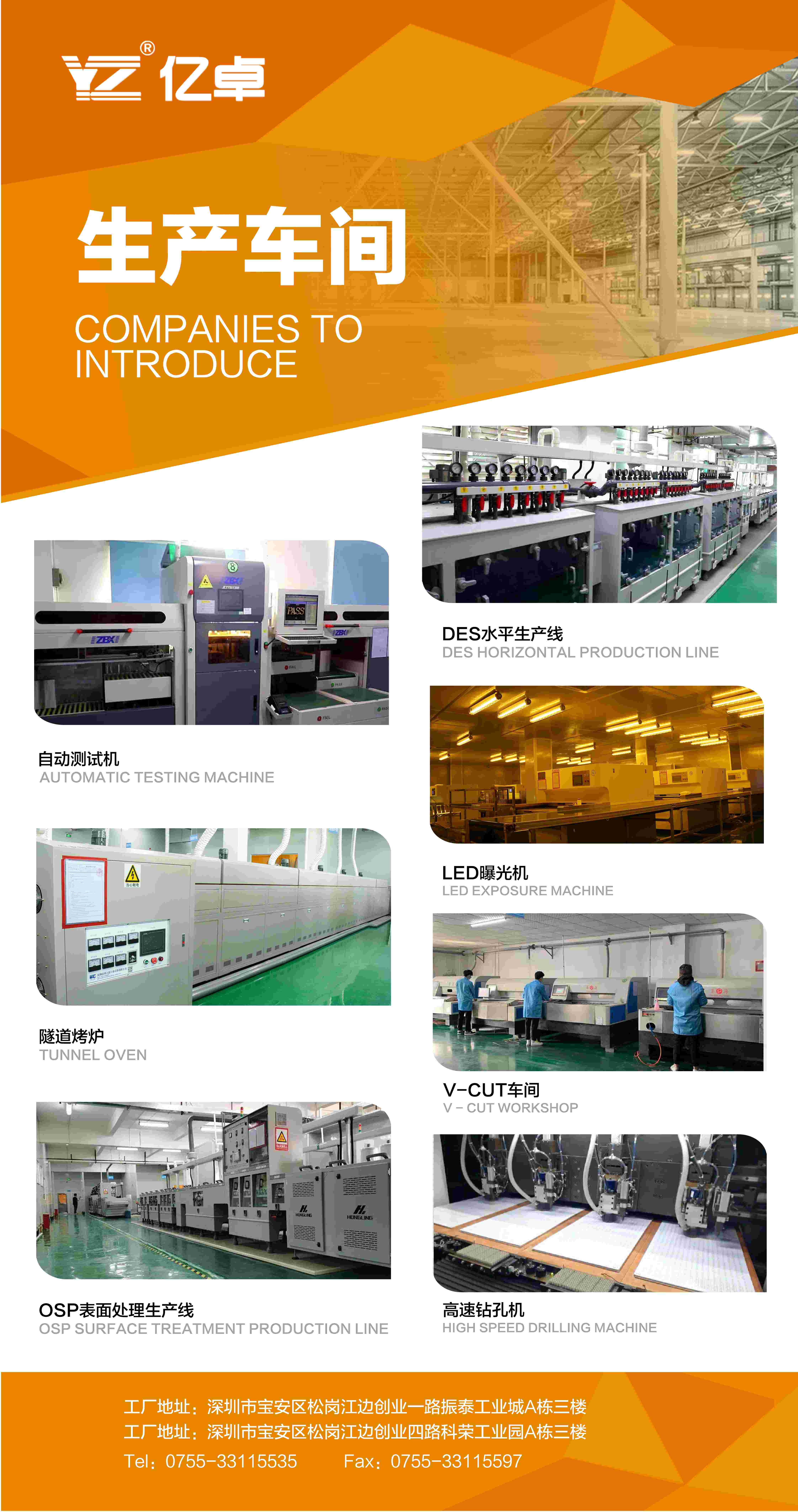 深圳市亿卓电子有限公司是一家专业生产高精密度单、双面、多层印刷线路板、铜基板、铝基板为主的企业。全套引进先进的线路板生产设备,聘用经验丰富的专业英才进行管理,是一家规模强大、设备完善、管理严格、品质卓越的专业线路板制造厂家。本公司生产的高精度、高密度电路板广泛用于计算机、通信、航空航天设备、汽车、电力供应、大功率LED照明及一般消费电子产品等领域,产品通过UL认证,符合欧盟RoHS指令的要求,性能达到IPC、MIL标准。 公司本著“精诚服务 精品质量 精益求精 精彩世界”的的质量方针,积极推广ISO9002质量体系,产品广泛出口到美洲、欧洲、日本、新加坡、韩国等国家和地区。“诚信、优质、高效”是公司的宗旨,客户为第一、做最好品质、达最高效率、创最低成本是公司立足市场寻求发展坚持不变的方向。