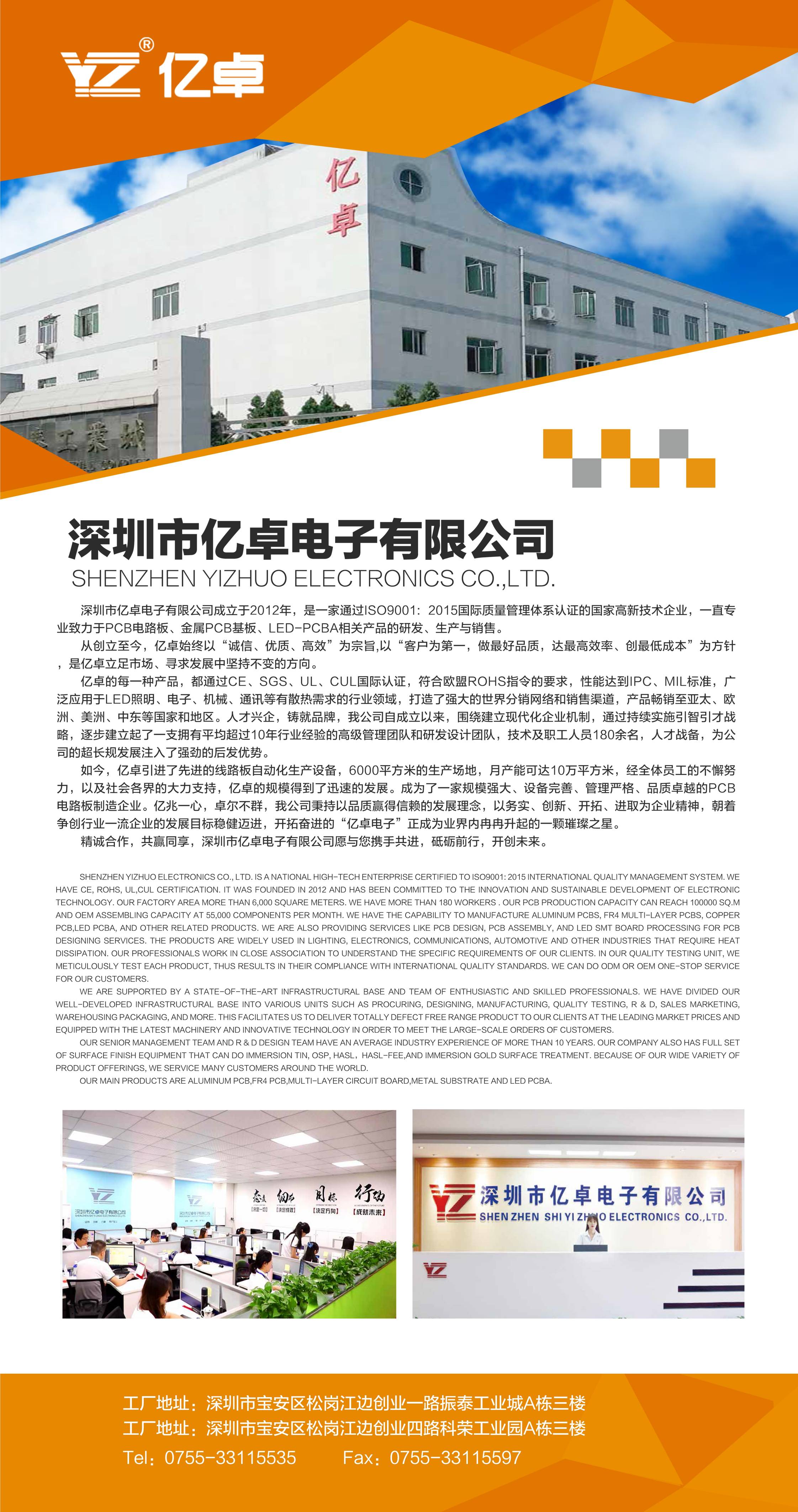 深圳市亿卓电子有限公司是一家专业生产高精密度单、双面、多层印刷线路板、铜基板、铝基板为主的企业。全套引进先进的线路板生产设备,聘用经验丰富的专业英才进行管理,是一家规模强大、设备完善、管理严格、品质卓越的专业线路板制造厂家。本公司生产的高精度、高密度电路板广泛用于计算机、通信、航空航天设备、汽车、电力供应、大功率LED照明及一般消费电子产品等领域,产品通过UL认证,符合欧盟RoHS指令的要求,性能达到IPC、MIL标准。 公司本著“精诚服务 精品质量 精益求精 精彩世界”的的质量方针,积极推广ISO9002质量体系,产品广泛出口到美洲、欧洲、日本、新加坡、韩国等国家和地区。“诚信、优质、高效”是公司的宗旨,客户为第一、做最好品质、达最高效率、创最低成本是公司立足市场寻求发展坚持不变的方向。