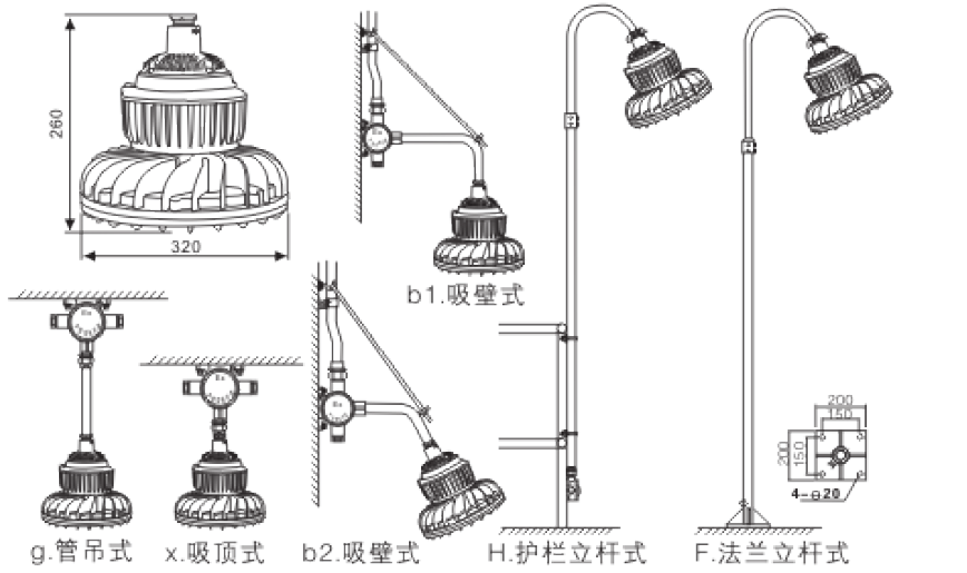 8.安装方式可根据实际现场需要,可选择通过支架实现不同角度的座式安装和侧壁安装及吸顶安装。
