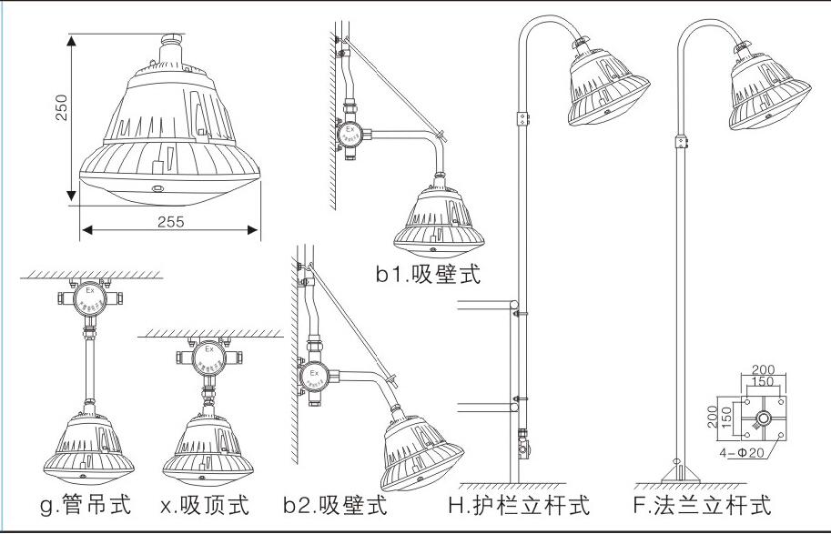8.安装方式可根据实际现场需要,可选择通过支架实现不同角度的座式安装和侧壁安装及吸顶安装。