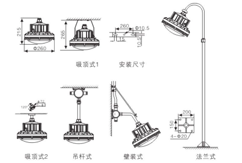 8.安装方式可根据实际现场需要,可选择通过支架实现不同角度的座式安装和侧壁安装及吸顶安装。