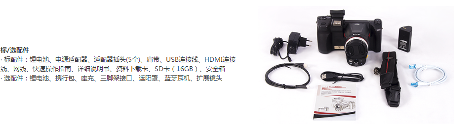 标配件 | 锂电池、电源适配器、适配器插头(5个)、肩带、USB连接线、HDMI连接线、网线、快速操作指南、详细说明书、资料下载卡、SD卡(16GB)、安全箱 | ||