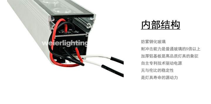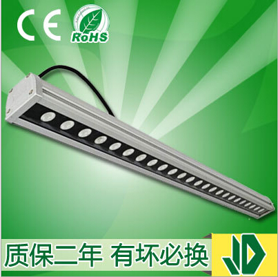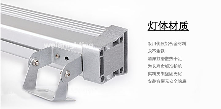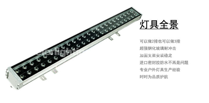 LED洗墙灯,顾名思义,让灯光象水一样洗过墙面,英文名led wash wall light ,又叫线型LED投光灯等等,因为其外形为长条形,也有人将之称为LED线条灯,其技术参数与LED投光灯大体相似,相对於LED投光灯的圆形结构,LED洗墙灯的条形结构的散热装置显得更加好处理一点