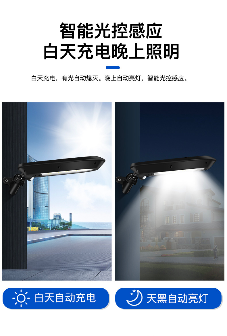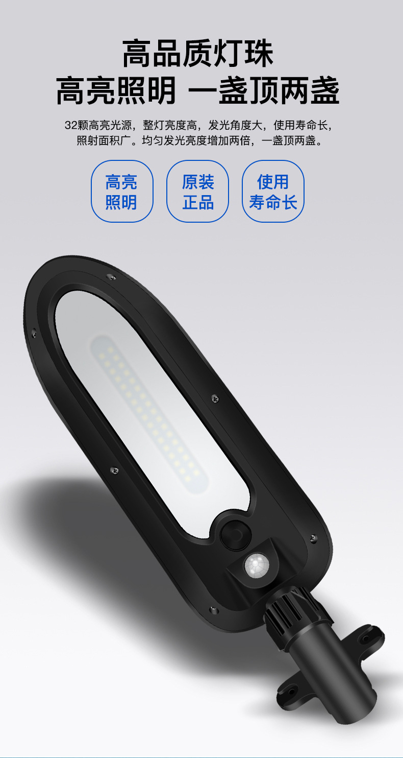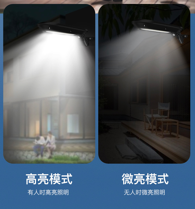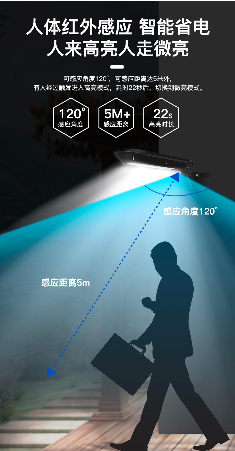 2、 单晶硅1.5W太阳能板,智能光控,白天充电晚上自动亮灯,智能人体感应,有人经过触发进入高亮模式,延时22秒后切换到低亮模式。