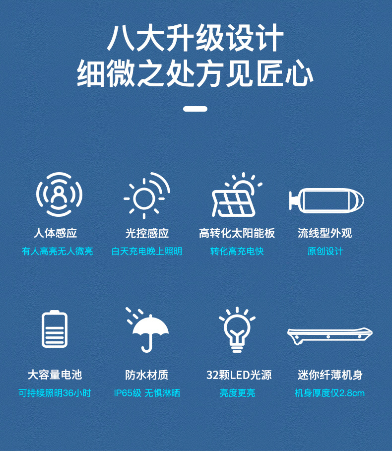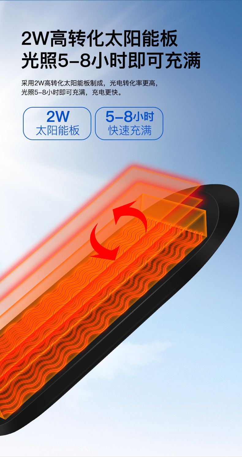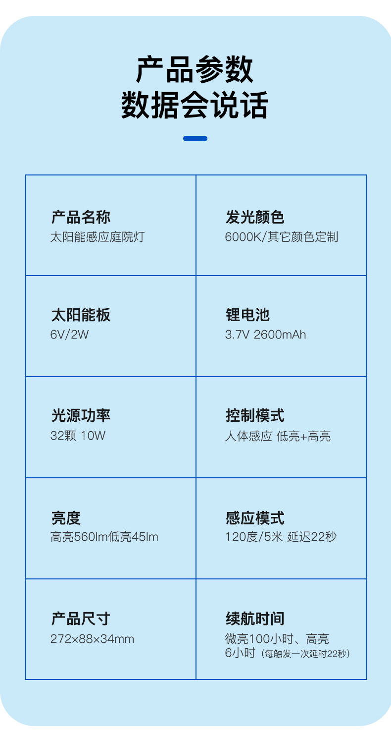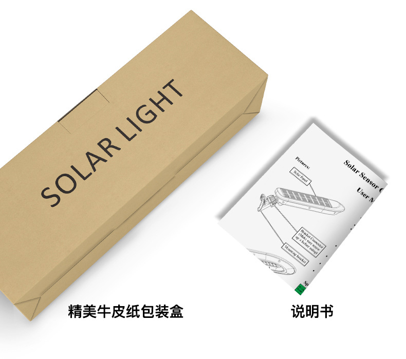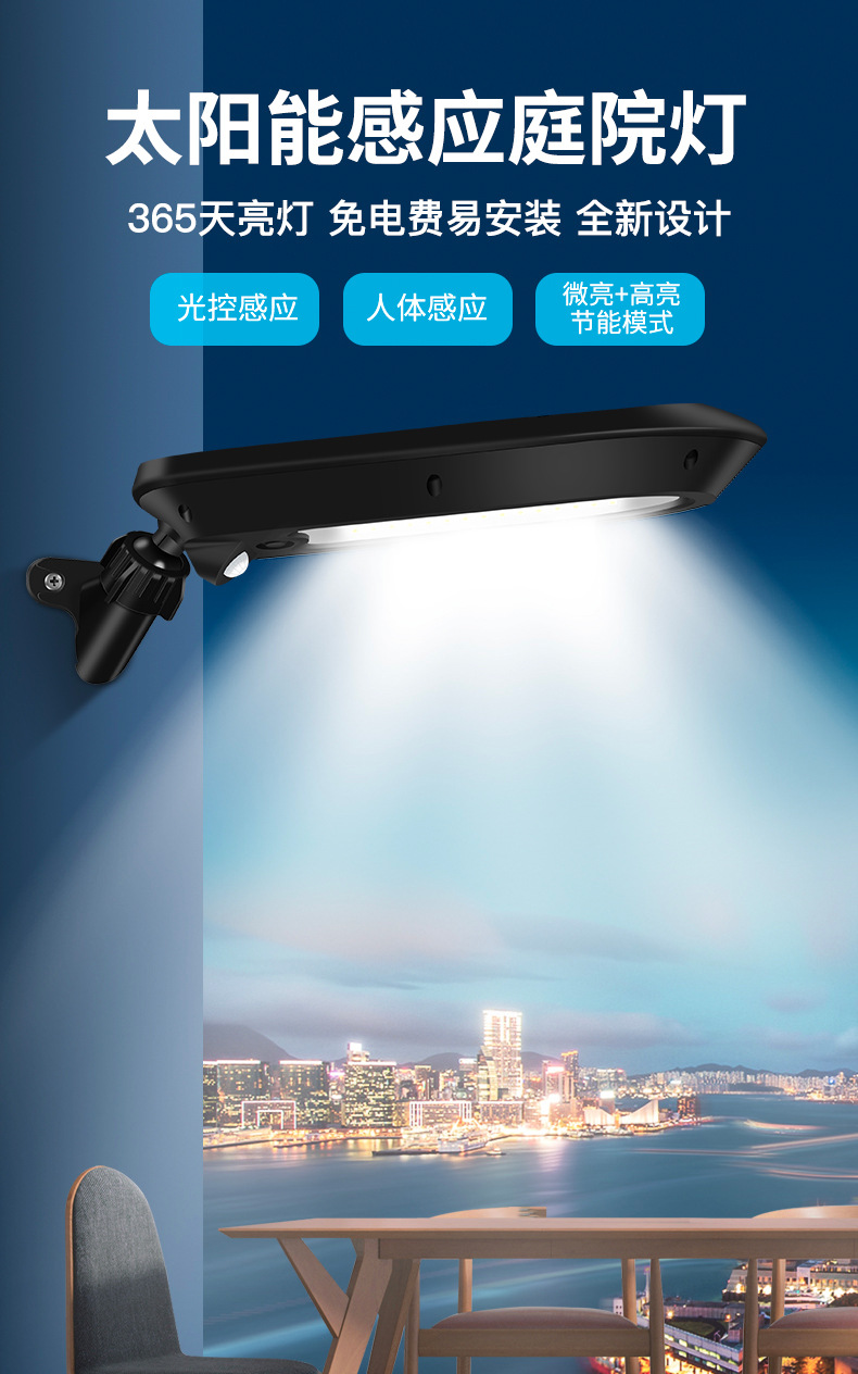 2、 单晶硅1.5W太阳能板,智能光控,白天充电晚上自动亮灯,智能人体感应,有人经过触发进入高亮模式,延时22秒后切换到低亮模式。