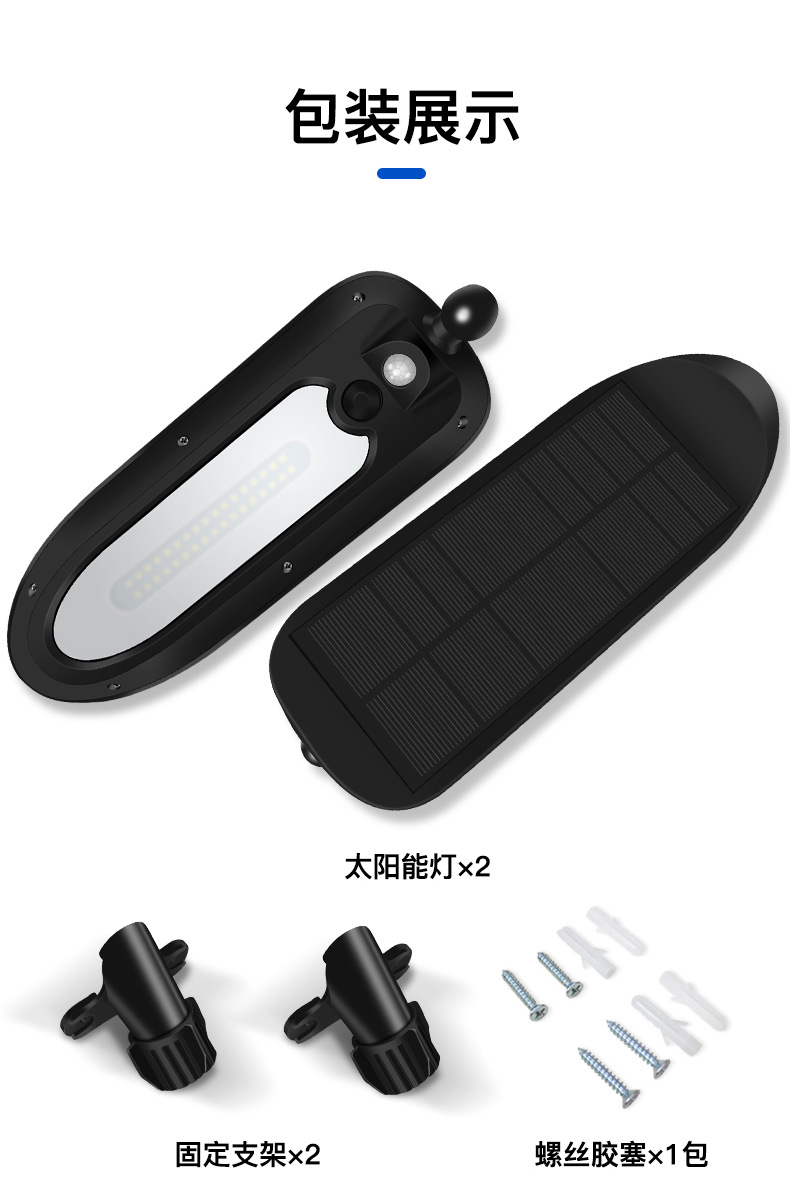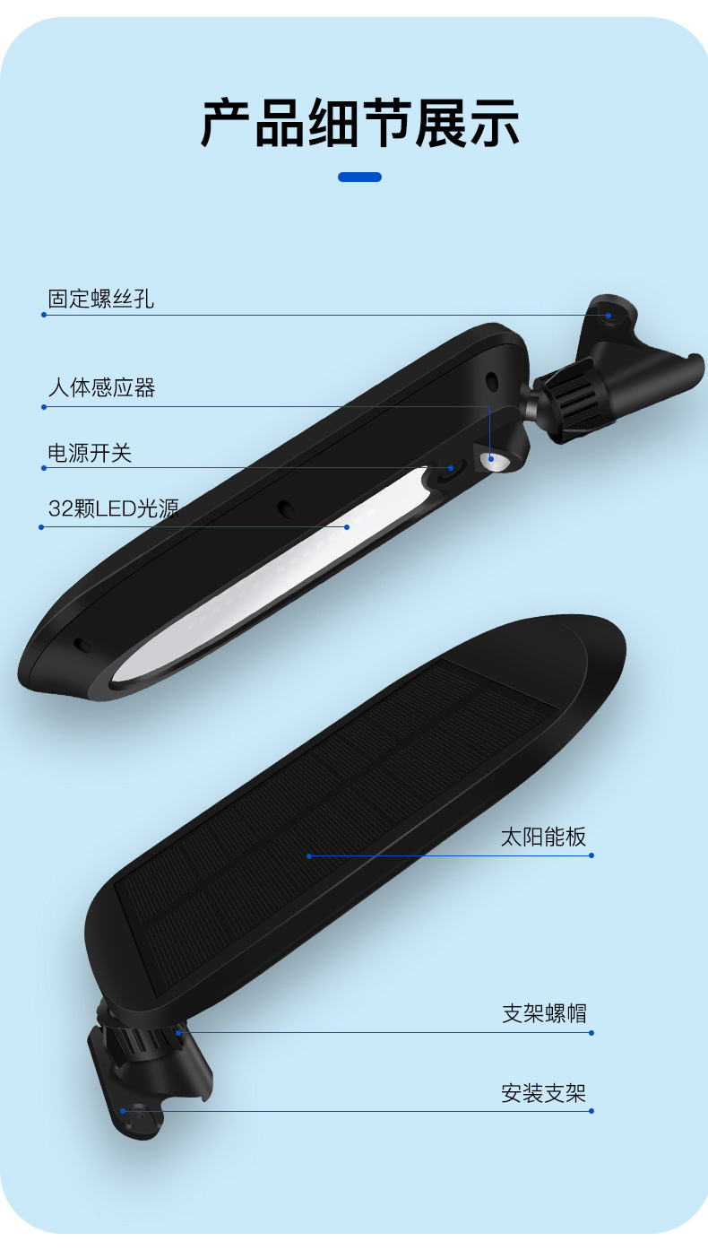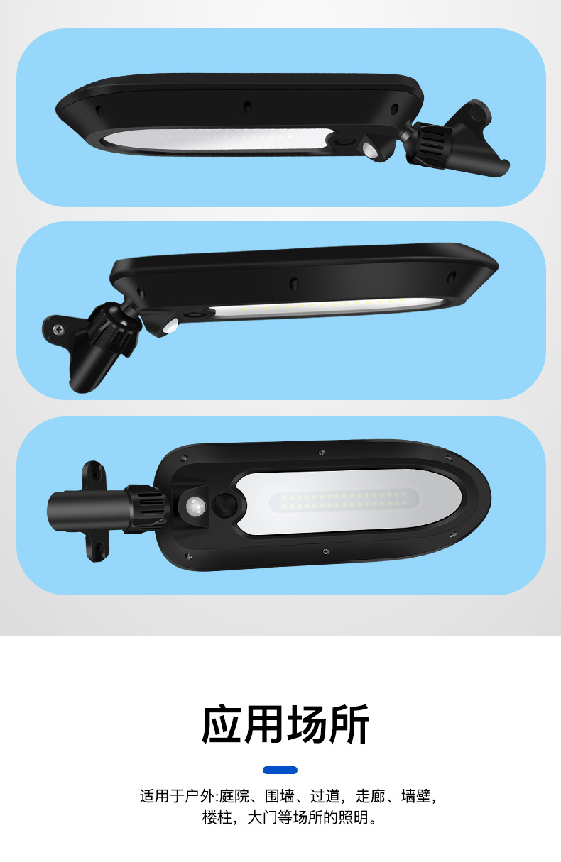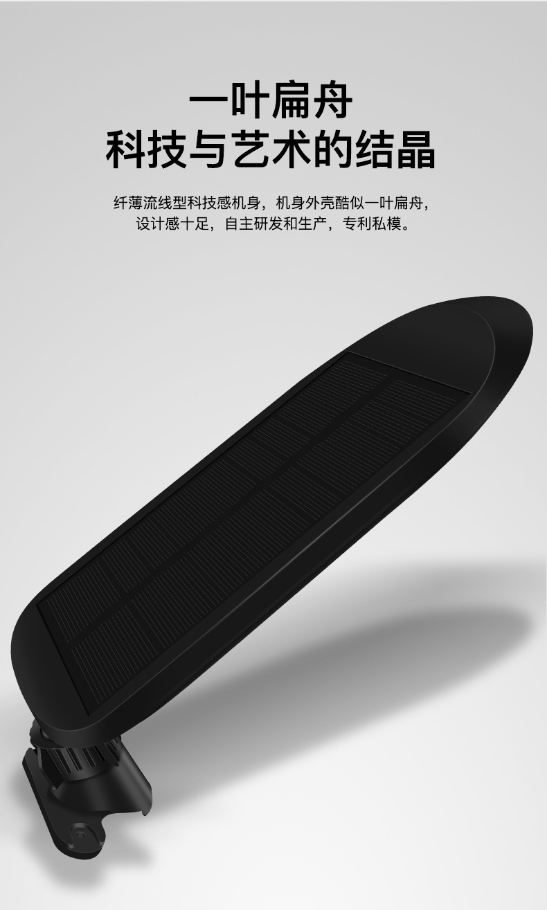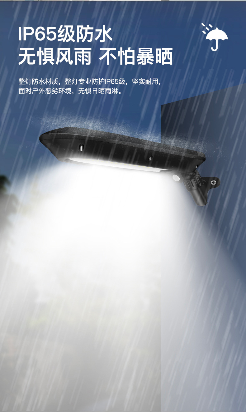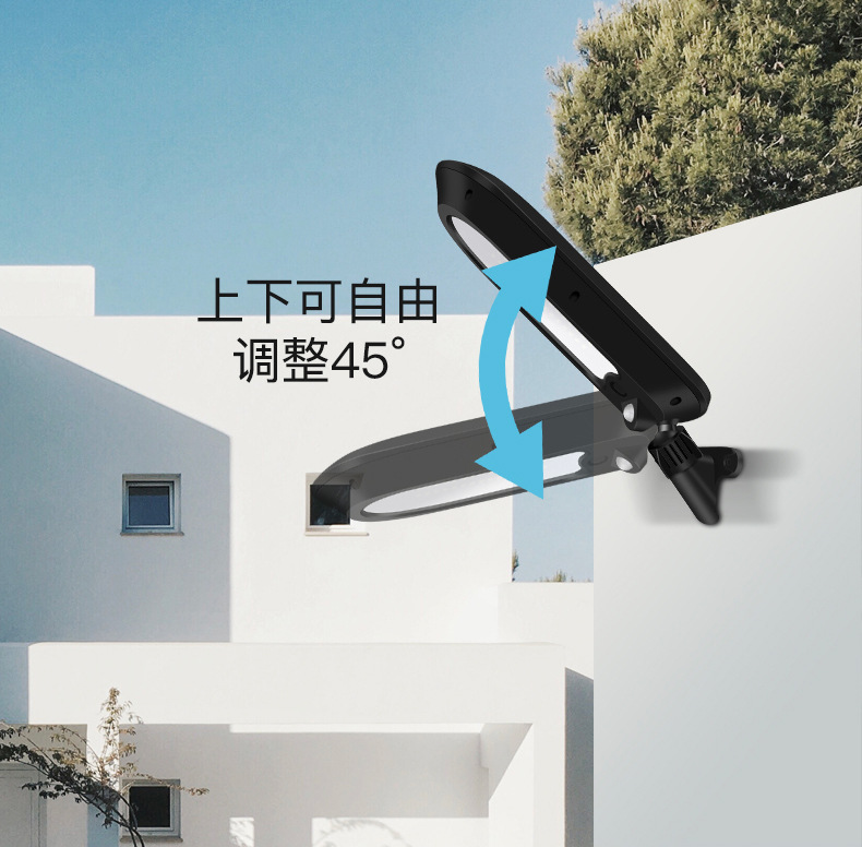3、 太阳能板一体设计,安装支架和灯体之间万向转轴,上下左右多角度可调,整灯IP65防水。
