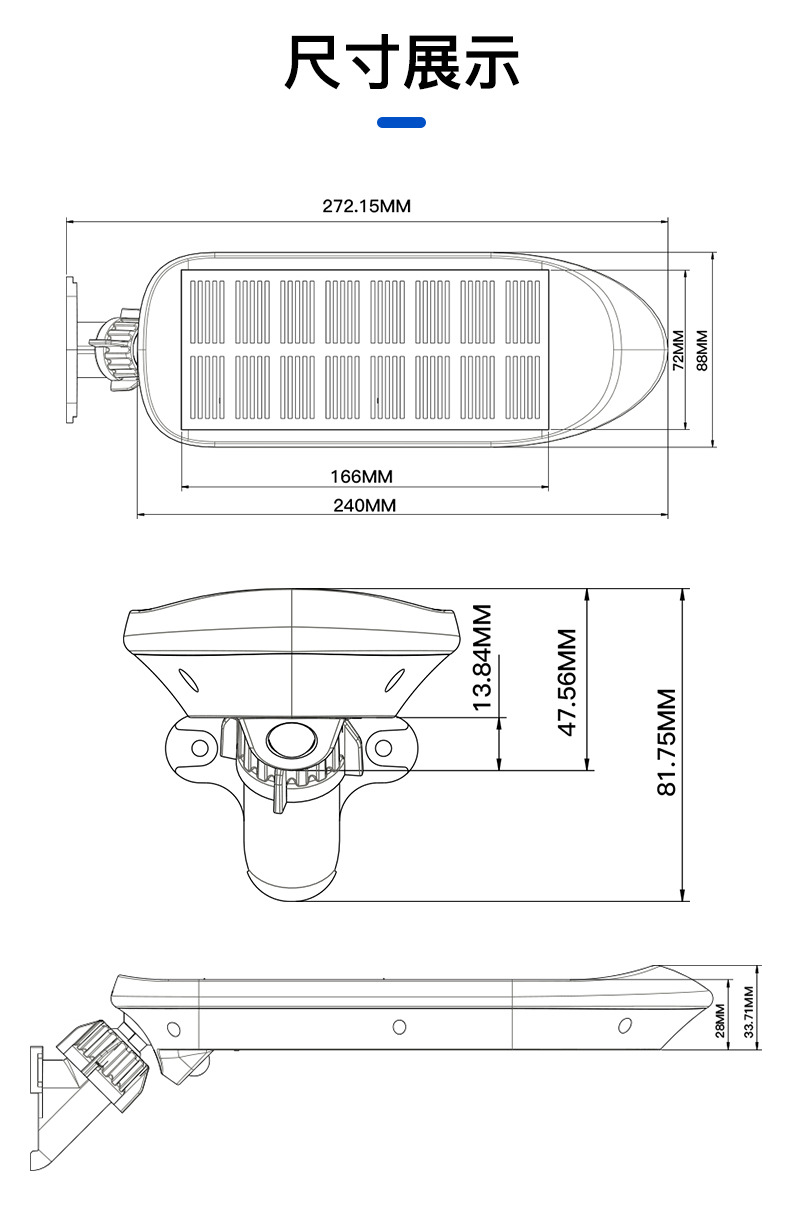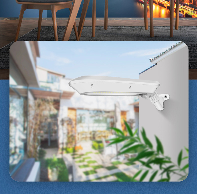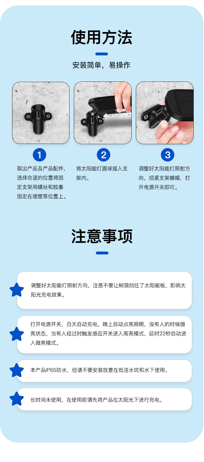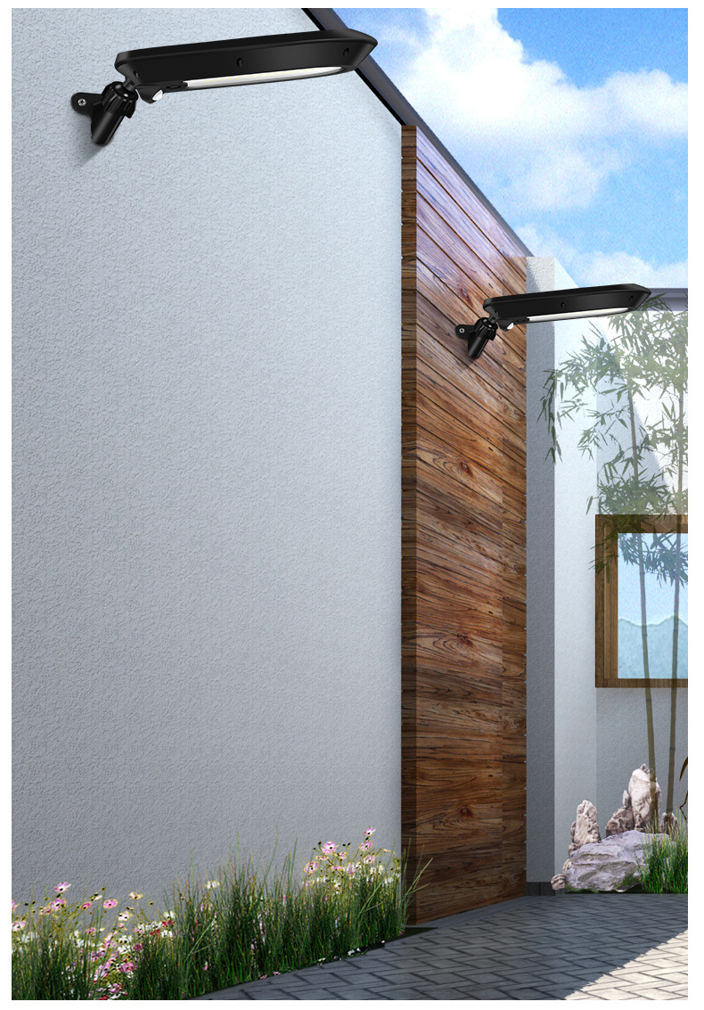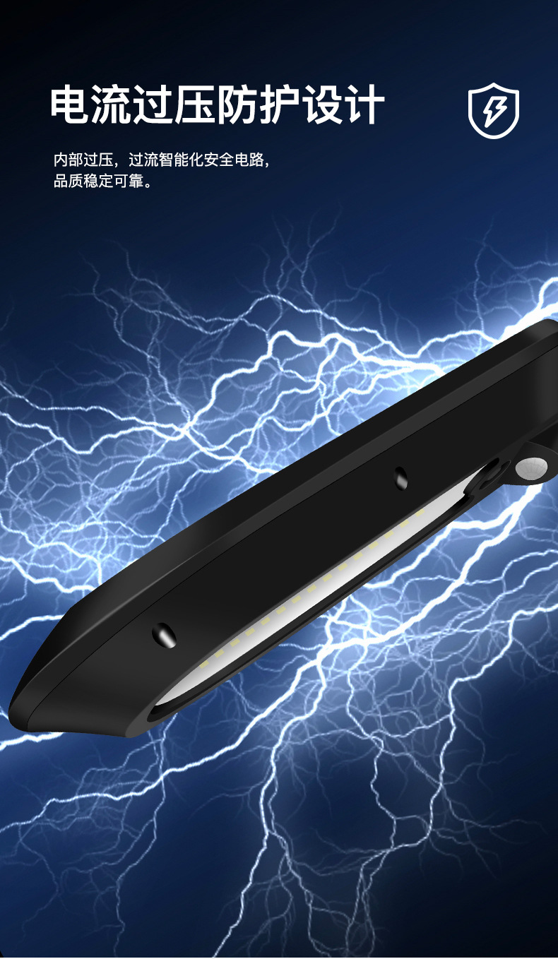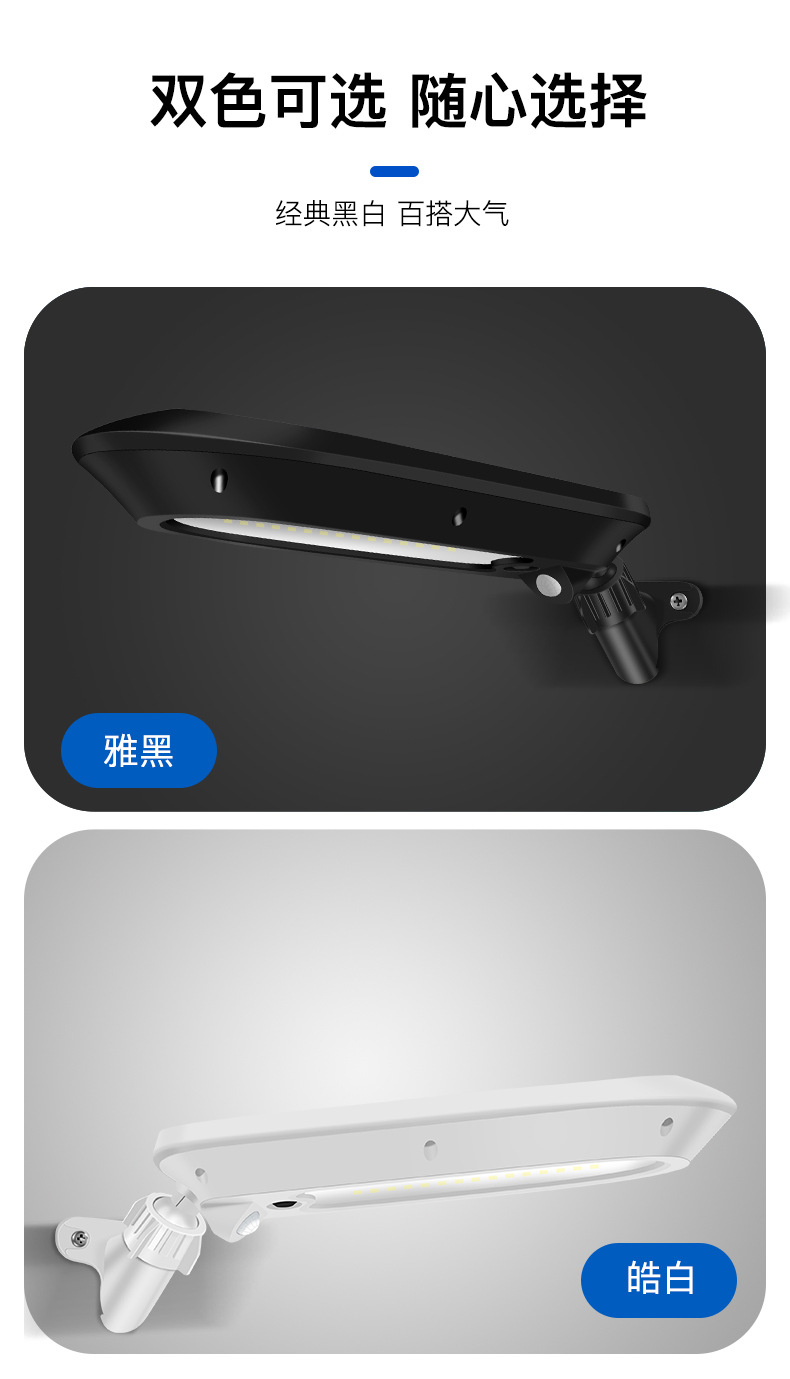 3、 太阳能板一体设计,安装支架和灯体之间万向转轴,上下左右多角度可调,整灯IP65防水。