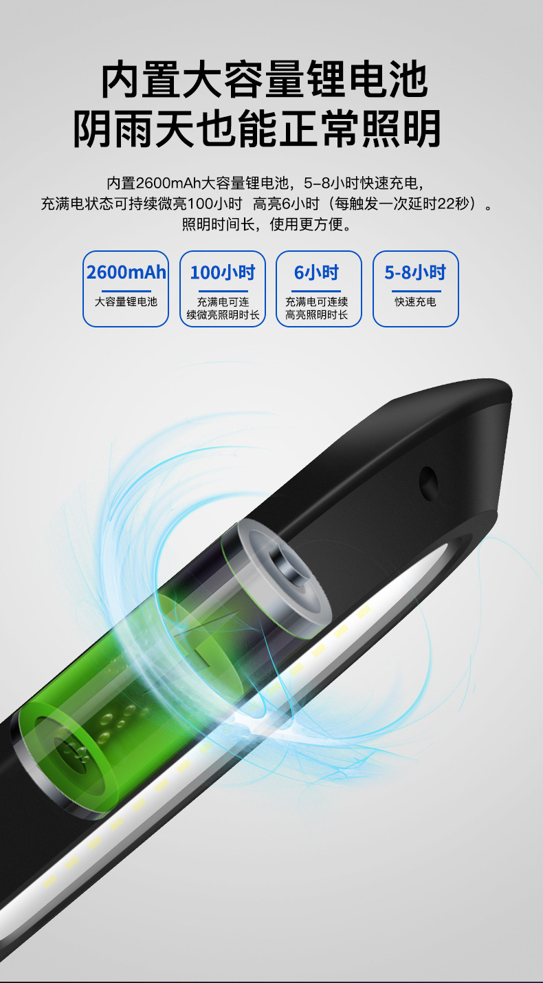 4、 内置1500mAh大容量锂电池,照明时间超长。