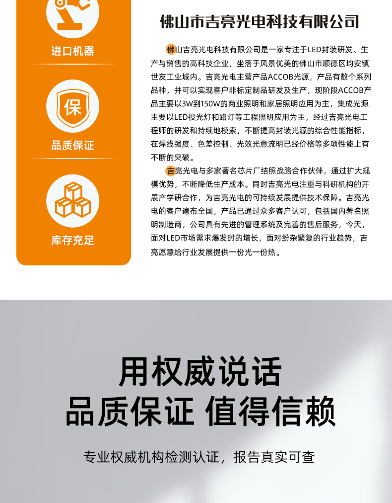 佛山市吉亮光电科技有限公司成立于2014年,地址位于广东省佛山市顺德区均安镇世友工业城6栋201,所属行业为电气机械和器材制造业,经营范围包含:生产、加工、研发、销售:照明灯具及其配件、LED系列产品、电器;承接照明电器工程设计及施工。