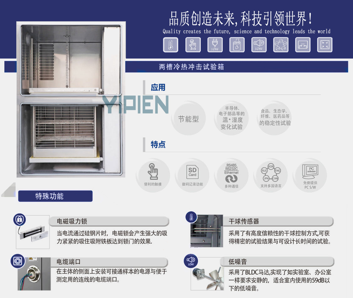 公司自成立以来一直专注于可靠性测试设备的技术,成为了广东省民营科技企业、东莞市民营科技企业、并通lSO9001:2008质量体系认证企业、公司不断精益求精,创造符合规范要求的应用价值,客户产业遍及于新能源、电子、半导体、LED光电、太阳能光伏、橡胶塑胶、通讯、航空、电池、汽车…等科技产业,从产品研发到售后服务,每个环节之间,都以客户的观点与需求作为思考的出发点。经历多年来的努力, 成功研发出产品系列有:可程序恒温恒湿试验箱、LED专用恒温恒湿试验箱、太阳能双85恒温恒湿试验箱、步入式恒温恒湿室、冷热冲击试验箱、快速温变试验箱、热冲击试验机、精密高温烤箱试验机、UV紫外线老化试验机、淋雨试验箱、沙尘试验箱、盐水喷雾试验机、塑料/胶金属分离器、金属拉力试验机、塑胶冲击强度试验机、塑胶熔融指数测定仪、振动试验台、各类寿命试验机等为我司核心产品。