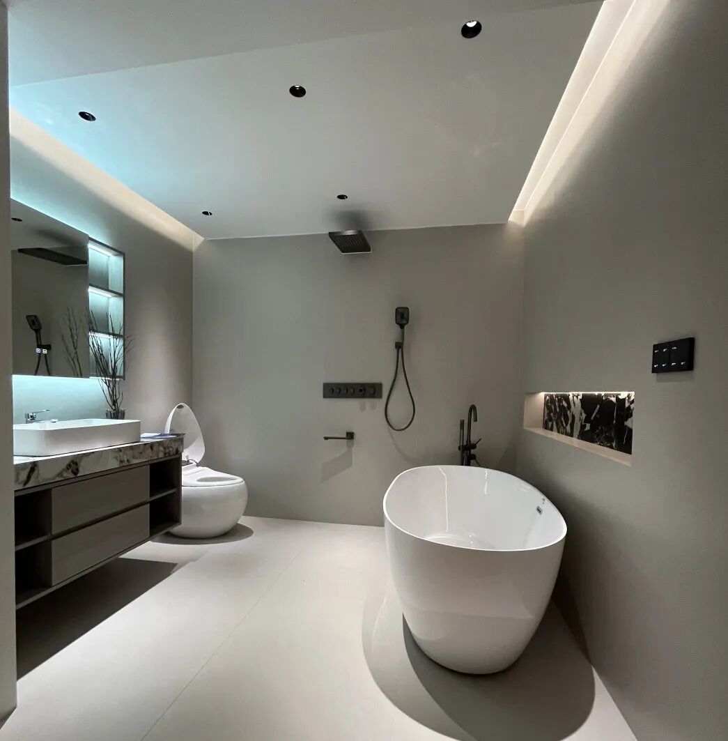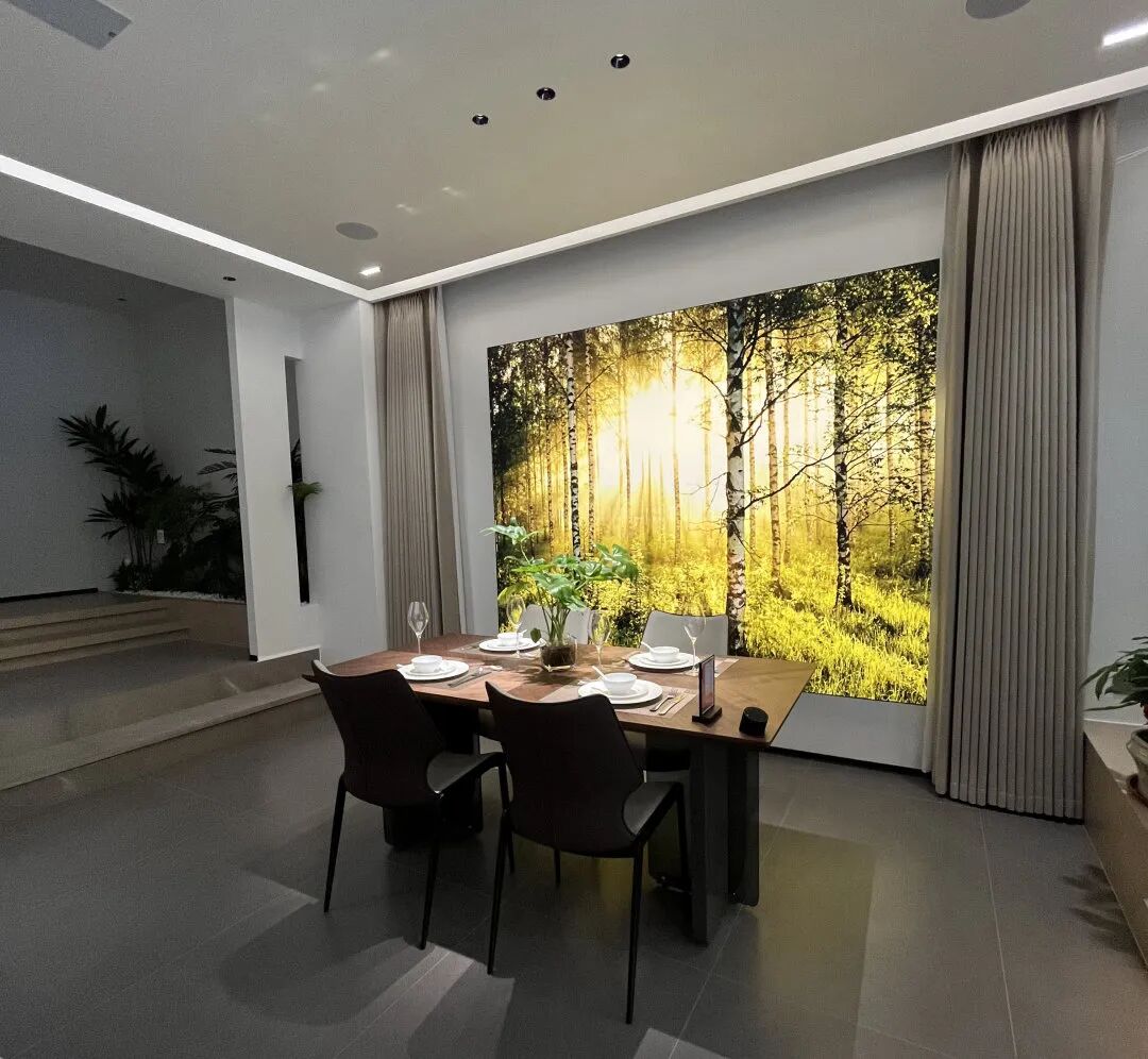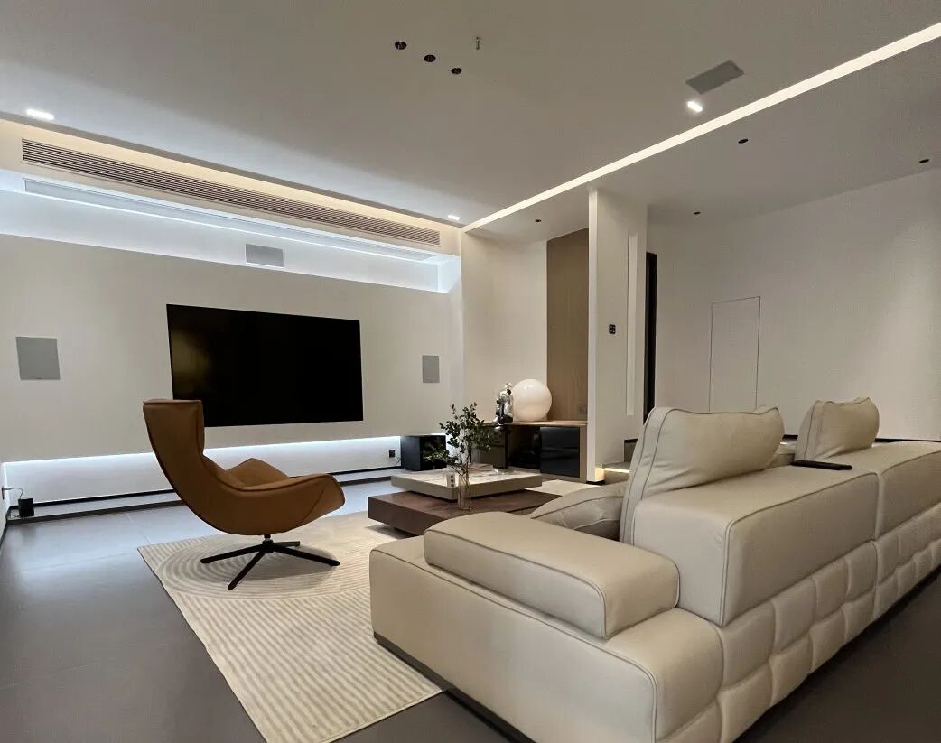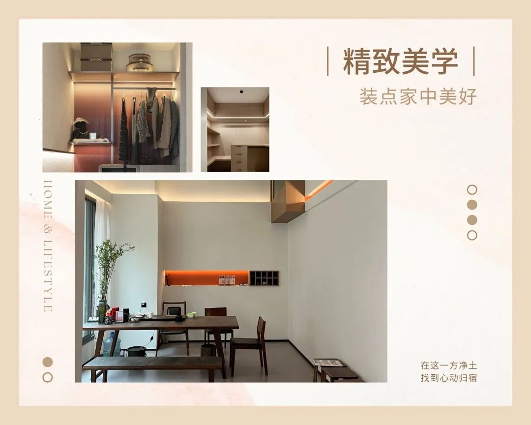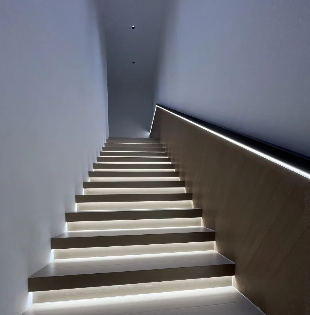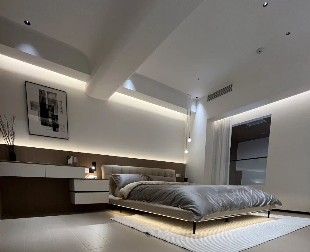 项目简介: 这是一个居住着90后一家三口的房子,我们了解到身为90后居住者的他们,对于如何构造自己未来的居住空间时,他们的想法是空间尽可能敞开的、自由的、不被拘束的,能够追随成长的脚步,亦能承载日常的欢声笑语。 本案以“简约”+“质感”为核心 打造宁静和谐的家居氛围 让自由形态成为空间的主旋律 1 客厅 客厅空间基调是采用低饱和度的米色系,搭配浅灰瓷砖,家具则以真皮与木质的材质为主,整体去装饰化,留白统一无跳色。 在灯光设计上亦是遵循至简的概念,在悬浮吊顶上安装低压灯带做基础照明,重点照明则选用防眩筒灯,光线舒适不伤眼,以此来全方位满足用光需求。再利用灯光3500-4000k纯净的光色照射,使空间在灯光的洗礼下,将留白体现得淋漓尽致,更加的精简、纯粹、自然的空间质感。 2 餐厅 餐厅灯光主要是照明餐桌和餐桌周围,继续沿用筒灯做重点照明,在餐桌正上方安装3盏防眩筒灯保证有光源打到食物上面,既满足了食物被提亮的效果,又能避免直接眩光。 而安装在反光灯槽的低压灯带做主照明,渲染就餐环境的氛围外,与墙上的森林壁画明暗光影充分融合,让空间回归自然的形态,增添松弛感和静雅的美感,在此品三餐四季,尝人间烟火味。 3 卧室 卧室应注重舒适性,灯光要层次分明,在床头灯槽与窗帘盒灯槽安装灯带,为卧室提供柔和的环境光;防眩筒灯和床头小灯则提供重点光,可满足躺在床头读书等用光的需要,营造安静淡然的氛围,勾勒静谧的美好,让人倍感舒适。 局部照明的灯具采用吊线几何圆形元素作装饰照明,床下氛围灯绕床边一圈,不仅让夜间行走更安全,也为空间带来活跃度,形成自由度与实用性适宜的弹性空间。 4 卫生间 嵌入式筒灯垂直照射做主照明,同时避免面部投射暗影,方便梳洗打扮。镜前氛围灯用3500-4000k柔光色温实现氛围照明,点线结合的灯光氛围柔和惬意,容易让人放松,祛除身体疲惫的同时也给心灵洗个澡。 5 楼梯 楼梯的活动路径不仅是通行路线,而是与空间的各个部分相互交融,发挥着承上启下的功能。每一级台阶都安装了踏步灯,灯光引导着我们脚步,拾级而上就像走上了星光大道,轻奢质感油然而生。 6 休闲区 于喧闹红尘中造一方净土,故设有休闲区域作为过渡,延续着主基调,暗藏向上线性光线,让墙面呈现均匀洗墙效果,增加空间轮廓效果和层次感。 若说到实用性和观赏性,那无疑是壁龛了,壁龛的设计与墙面一体化,除了增加虚实变化外还强调了空间的层次感和深度感。当然,也少不了灯光的装饰效果,在壁龛内嵌入线性氛围光,在暗藏光的映照下,衬托出陈列品的魅力,给空间创造出意境美,提升艺术氛围。 对于现代室内装饰,不仅要注重室内空间的构成要素,更要注重照明对室内外环境所产生的美学效果以及由此而产生的心理效应,从而创造一种健康、舒适、优美的生活光环境,赋予居住者简单舒适住宅体验,同时也带来了极致美感的视觉冲击力。