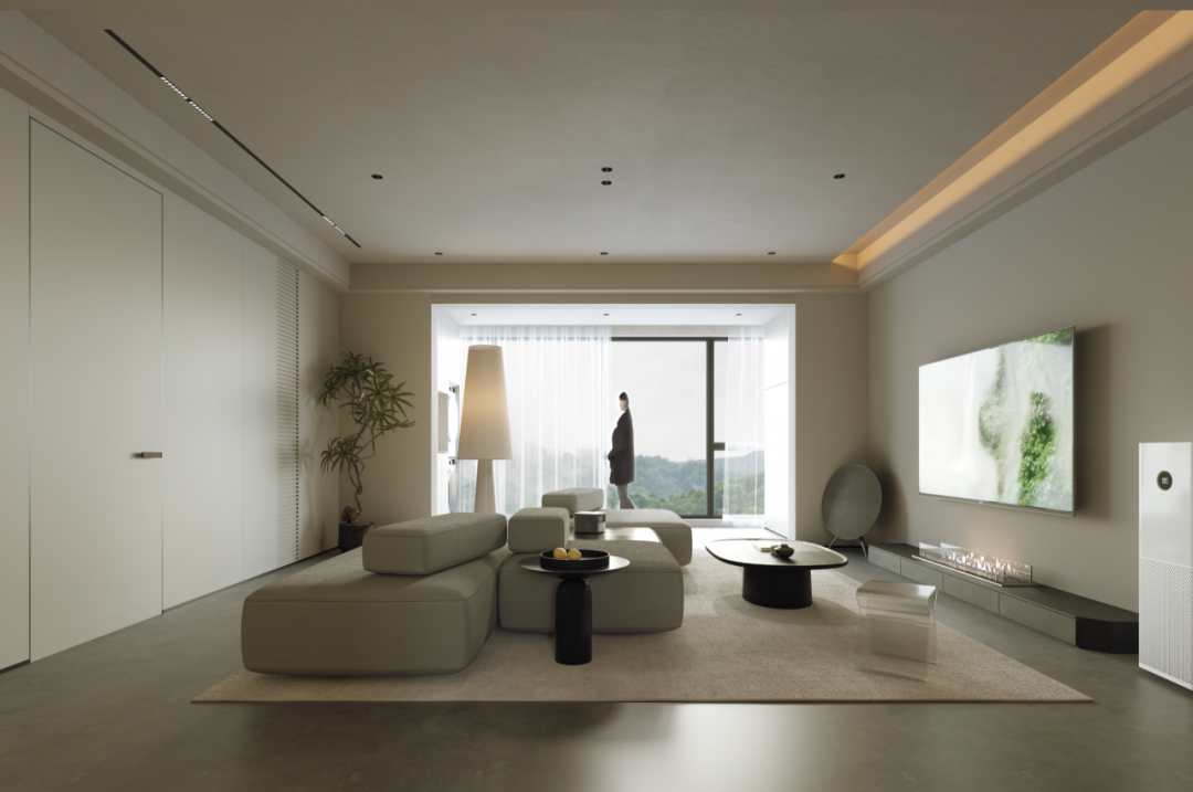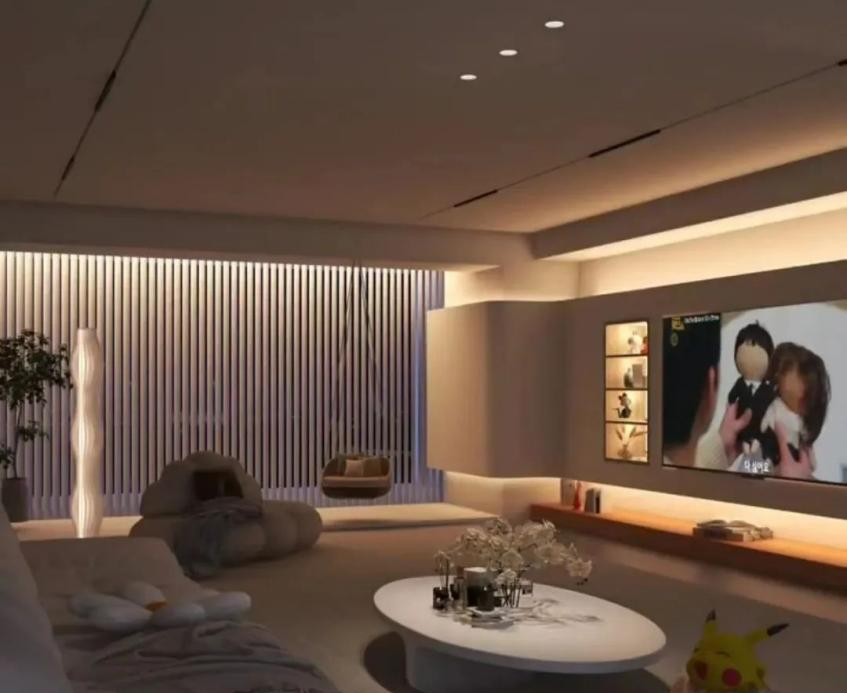 背景墙氛围灯,将光线凸显在投射电影的区域,减轻屏幕与周围的亮度差,低亮度、低照度的环境让人的精力能够更加集中观影和放松心情。