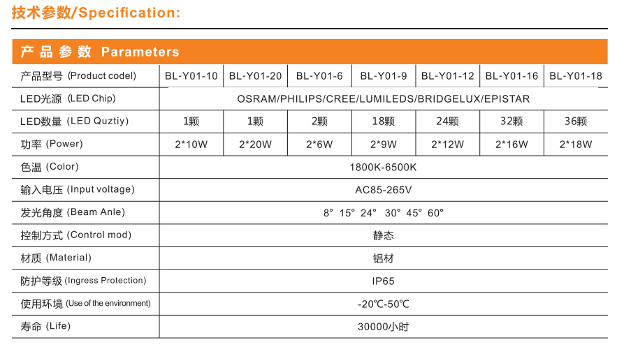 • 光束角(°) 6-10°、11-20°、21-40°、41-60°