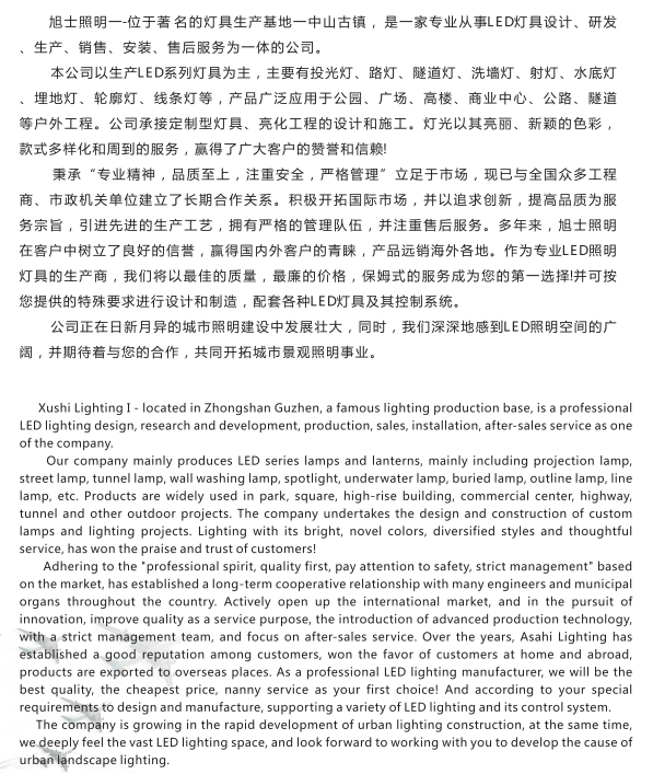 中山市旭士照明有限公司位于中国灯都——中山古镇,中山市旭士照明是一家专业从事LED大功率户外亮化产品、大功率LED室内商照、户外亮化产品、LED装饰灯具、LED节日喜庆灯具等系列产品的研发、生产、销售和服务为一体的高新技术企业,公司成立于2006年,在发展中不断加强研发,现拥有雄厚的技术实力、高素质的管理团队、强大的生产能力、和专业完善的品质管理系统。 我公司的服务对象是经销商、贸易商、广告装修公司,工程商及终端客户。公司在LED室内外亮化工程方面积累了丰富经验.主要优势产品是LED商业照明、家居照明和户外照明系列。产品服务包括LED洗墙灯、LED投光灯、LED水底灯、LED地埋灯、LED轮廓灯、LED户外亮化产品、LED室内商业照明、LED天花射灯、LED贴片平板灯、LED贴片灯带、LED日光灯、LED轨道灯、LED灯杯球泡、LED壁灯、LED吊灯等,欢迎各新老客户前来参观洽谈