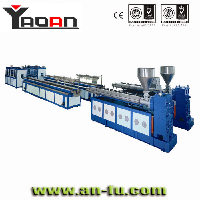 该设备配置相应的方机,模具及辅机,可用于多种规格,形状的塑胶管材、异形材的生产。适用原料:PC、PMMA、PA、PP、PE、ABS、POM、PVC、475等。特殊设计的螺杆、料筒、确保设备的高速押出及优良的塑化效果。配置三维电动真空冷却水槽,机械式的高度调节和侧向调节方便操作,并确保了产品的定型精确。牵引装置与押出机同步工作,锯片的直接传动装置,可配合多种产品的切割要求。