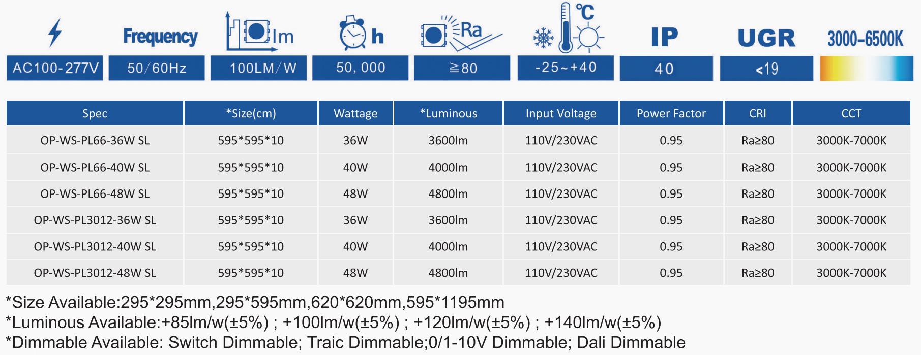• 灯具尺寸 300*300mm、600*600mm、1200*300mm、1200*600mm
