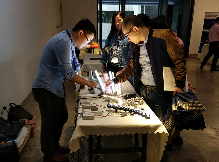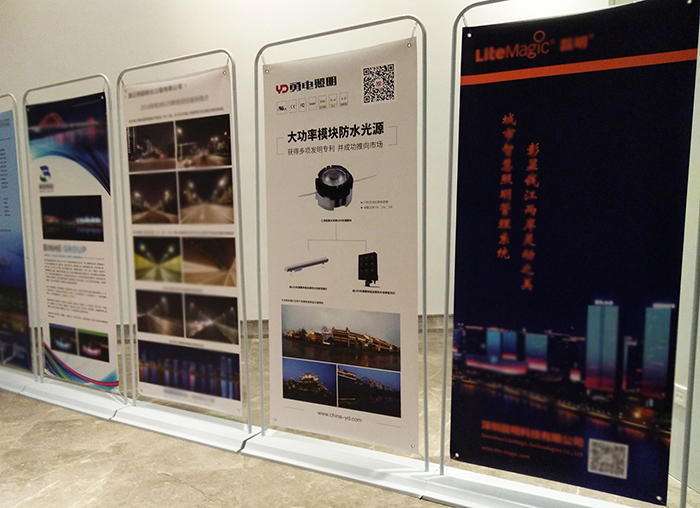 会议厅外,展示有勇电二次封装点光源、线条灯、洗墙灯、大功率系列等照明灯具,参会嘉宾能够更直观的了解到勇电照明灯具在不同工程项目上的个性化应用。勇电大功率系列灯具解决了传统户外大功率LED灯具结构防水的高成本、低稳定性等问题,实现了光源模块组合成洗墙灯、投光灯、水下灯等各种不同用途大功率LED灯具,可在水下、地下、外墙直接使用,适用范围广泛,吸引了很多参会嘉宾的关注。