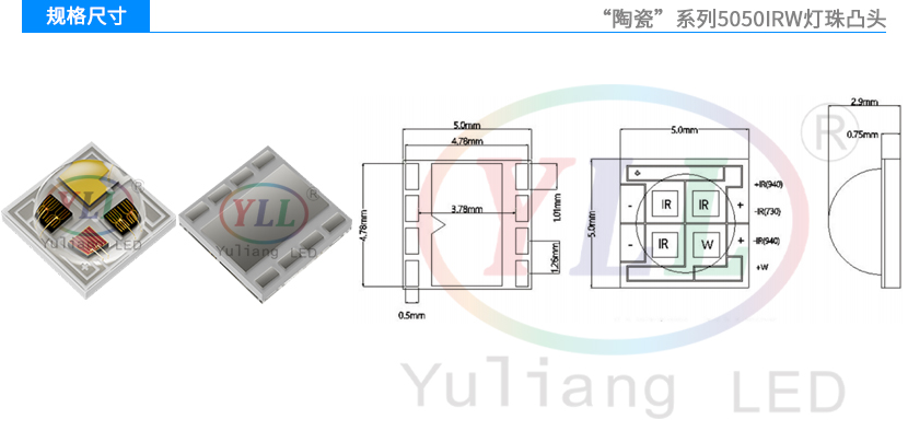 陶瓷系列5050 IRW 730nm 940nm贴片LED灯珠规格尺寸及特点:大功率、高亮度、发光效率高、低阻抗。