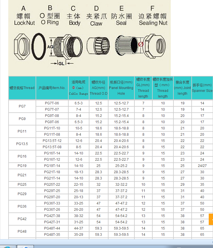 螺牙规格:公抽螺纹,德制螺纹PG系列