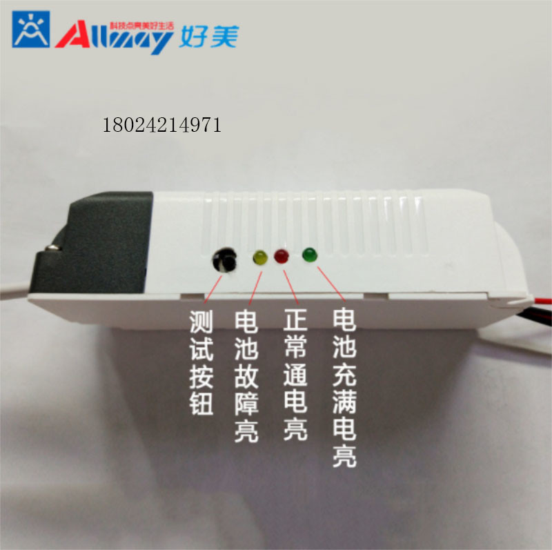 产品自带应急切换开关方便测试(右图黑色按键);故障检测(黄色指示灯);充电指示灯,正在充电时红绿灯亮;充满电时红灯灭绿灯亮。