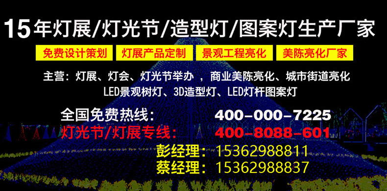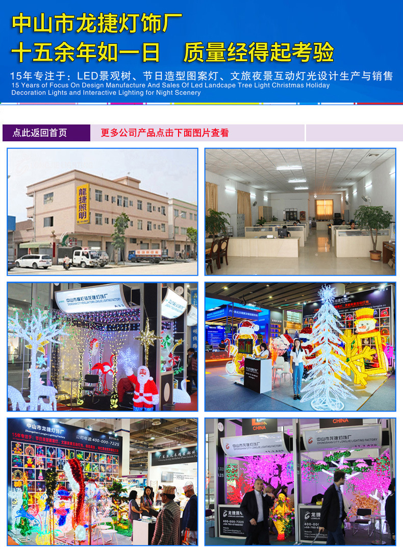 中山市龙捷灯饰厂成立于2007年,公司专注于景观树,造型灯,图案灯 , 传统彩灯,灯展及灯光节产品的研发生产与销售 。 公司强大企划设计团队,可以去到全国乃至全球为客户量身设计制作,年来合作过国内外数千家广告展览公司、工程设计机构等, 为产品的售前、售中、售后提供全程解决服务方案,让所有客户都能感受到龙捷的品质服务、承诺和保证。